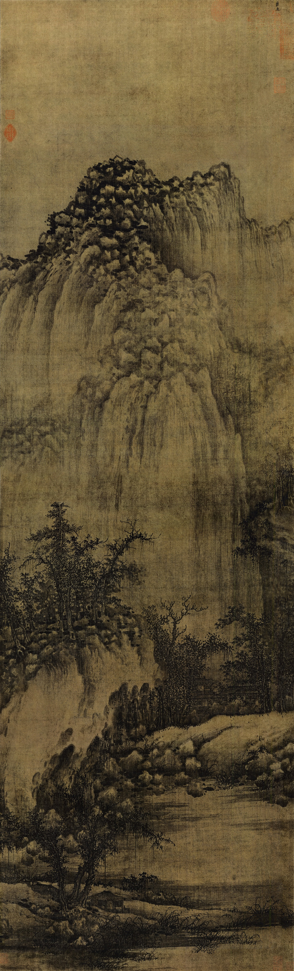 此图高耸云表的山峦雄居于画幅上部,山头布有矾头状的卵石,犹是巨然本色,下部冈阜林木葱郁,掩隐楼阁屋宇,前部有坡岸溪水,展示一片宁静清谧的意境。画幅右上有“巨五”编号,当是六幅通景屏风中的第五幅,仅为大幅山水的一部分。