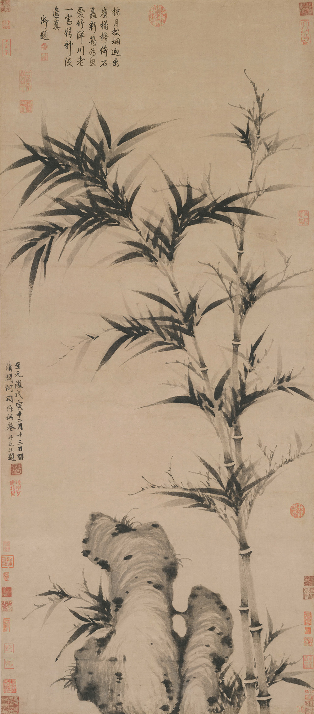 竹,由于被传统文人赋予了“虚心异众草,节劲逾凡木”的人格象征,因此,自宋代文同等人倡导始,到元代已成为极受欢迎的绘画题材。从技法上看,有勾勒填色的“画竹”与墨笔写意的“写竹”之分。此图即属于“写竹”一路画法。柯九思曾主张:“画竹写干用篆法,枝用草书法,写叶用八分或用鲁公撇笔法。”