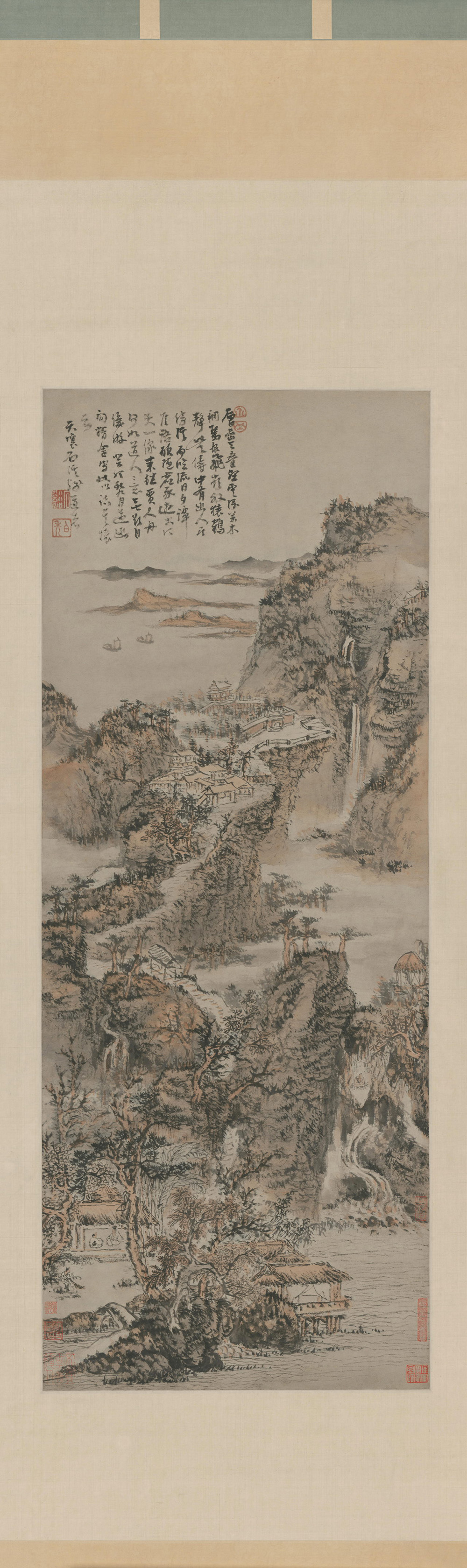 本幅自题五言诗一首:“層巒與疊壑,雲深萬木稠。驚泉飛嶺外,猿鶴靜無儔。中有幽人居,傍溪而臨流。日夕潭佳語,願隨鹿豕遊。大江天一線,來往賈人舟。何如道人意,無欲自優遊。癸卯秋九月,過幽閒精舍寫此以志其懷焉。天壤石溪殘道者。”钤“石谿”、“白秃”、“介丘”印三方。
