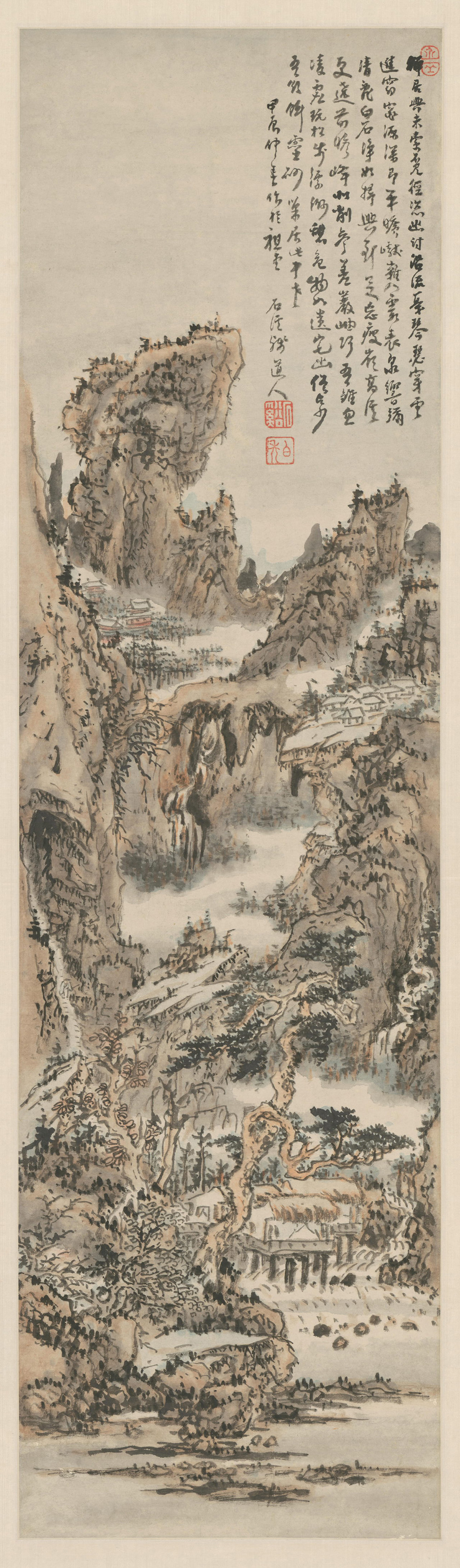 本幅署款:“甲辰仲春作于祖堂。石溪(谿)殘道人。”钤“石谿”、“白秃”、“介丘”三印。无鉴藏印。
