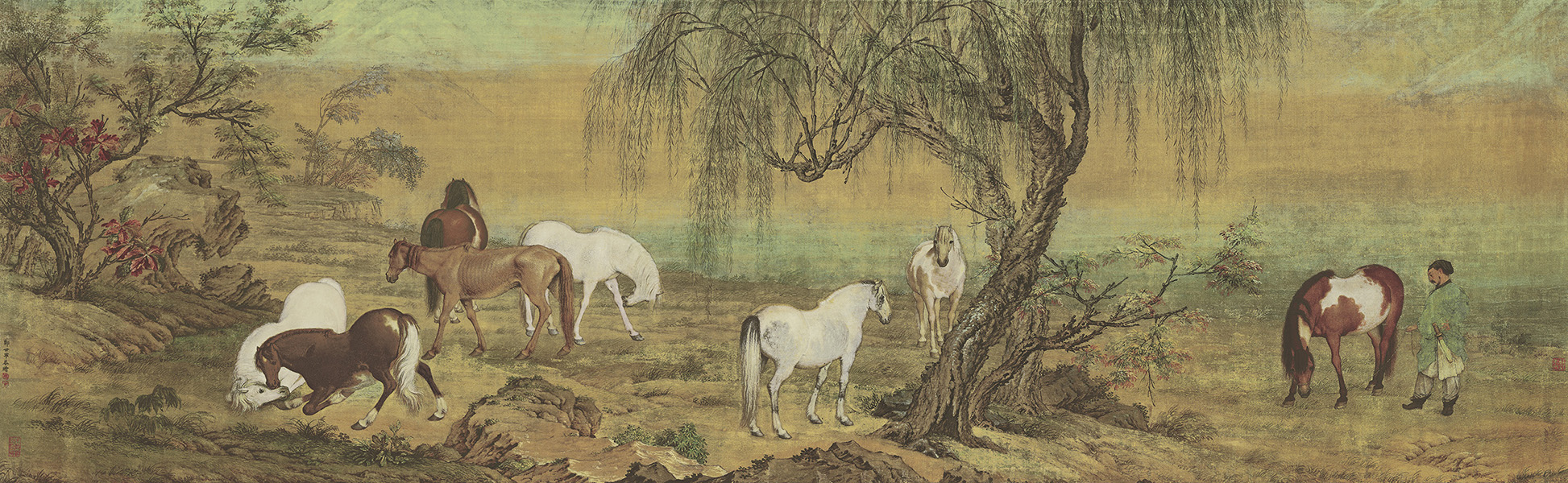 绘一片草丰水清之地,八匹骏马嬉戏打闹,一匹棕色马略显瘦削,背部肋骨突出,基它马匹健壮肥硕;右侧着绿色大褂的马官,手牵缰强,专注的盯着骏马吃草。技法上,背景以二色模糊处理,近景以写实处理,下垂的柳条、多彩的树叶,清晰、细致。