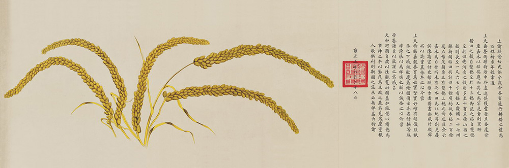 雍正初年,全国五谷丰登,雍正皇帝令大学士张延玉传旨,清朝御用画师意大利传教士郎世宁作《瑞谷图》,雍正五年八月二十二日,雍正皇帝颁示《瑞谷图》,并降旨曰:「今蒙上天特赐嘉谷,养育万姓,坚实实好,确有明征,朕祗承之下,感激欢着绘图颁示各省督抚等。朕非夸张,以为祥瑞也。自兹以往,观览此图益加儆惕,以修德为事神之本,以敬民为立政之基」。