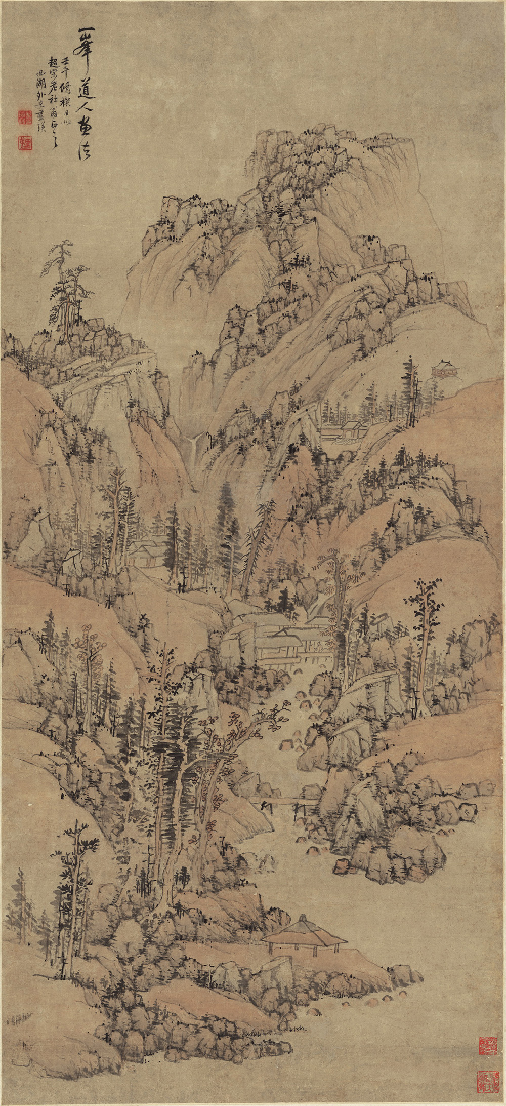 图绘群山绵延,树木葱郁,山间房屋数座,山脚流水潺潺。蓝瑛在山水画喜用笔方折,山石少皴,平顶,偶用折带、茶叶皴,略加修饰,山头多矾石,敷以淡青绿和浅绛,加以浓墨点缀,用笔极简,画面淡雅。