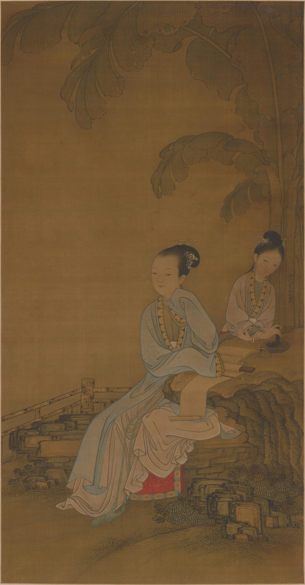 图绘芭蕉之下,女子支肘坐石桌旁。图绘芭蕉之下,女子支颐而坐,石桌上铺纸卷,面露沉思,似在索句,旁有仕女研墨侍候。作者以铁线描勾勒衣裙,方折有力。