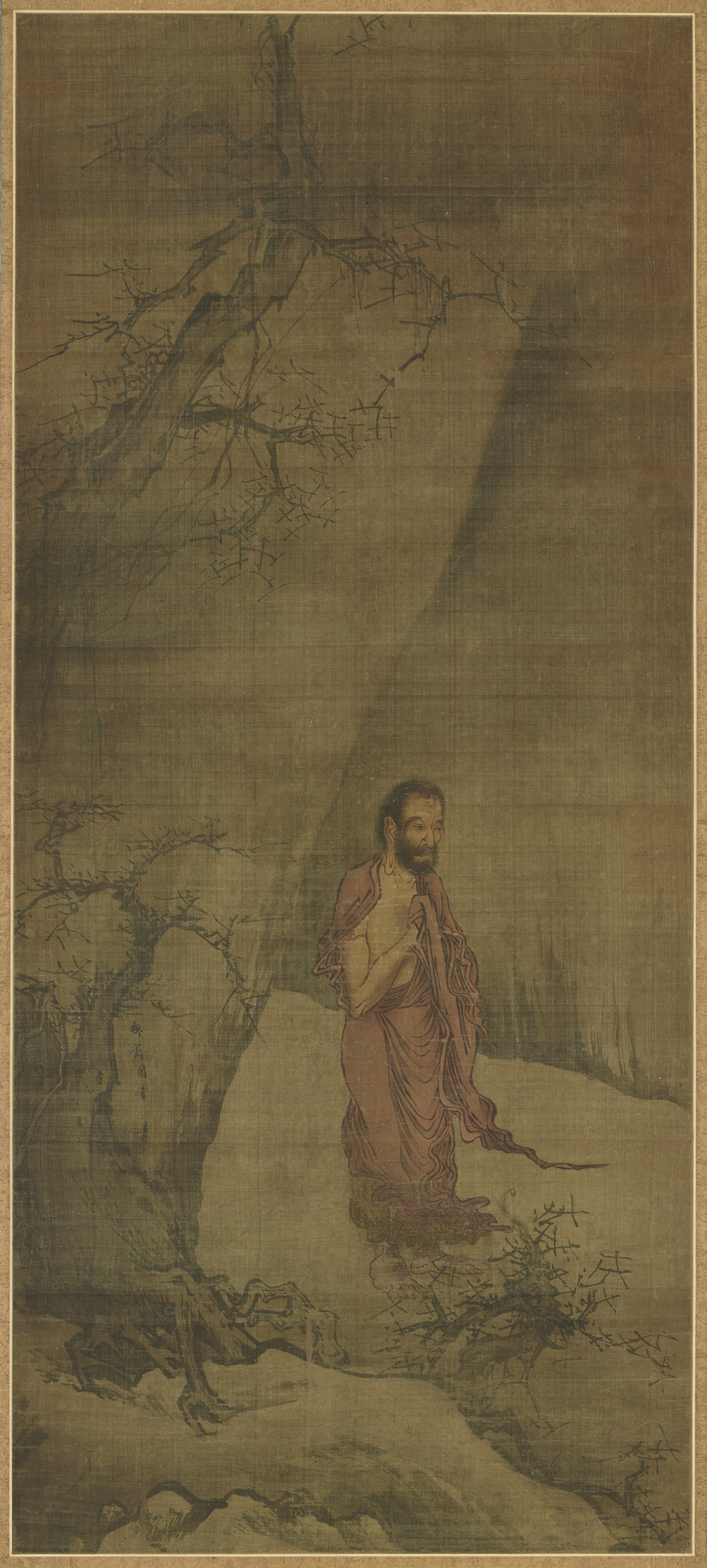 此幅构图以迫近观者的土坡枯木为前景,再以巨崖隔断空间的延伸,将表现重点集中在山罅间踽行而出的释迦上。款识:御前图画 梁楷。