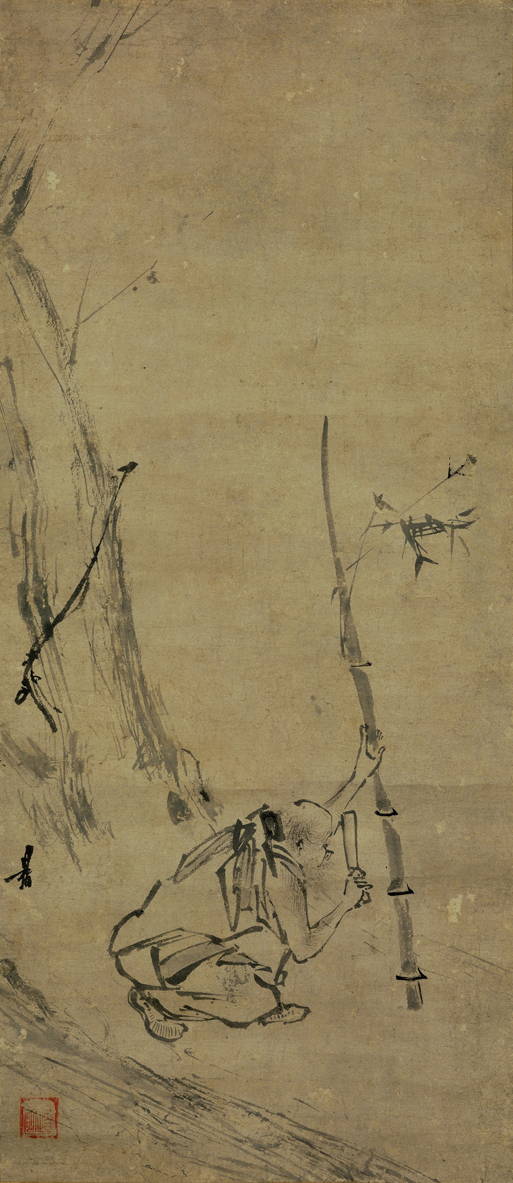 此画的下端,一老者身穿粗布短衣,蹲在那里;他左手扶着一根竹子,右手挥刀,正在专心致志地伐竹。看他那凝神静气的样子,似在劈竹的瞬间感悟禅机,仿佛在揭示着禅宗六祖惠能强调的从行住坐卧等日常生活中也能自然顿悟的道理。