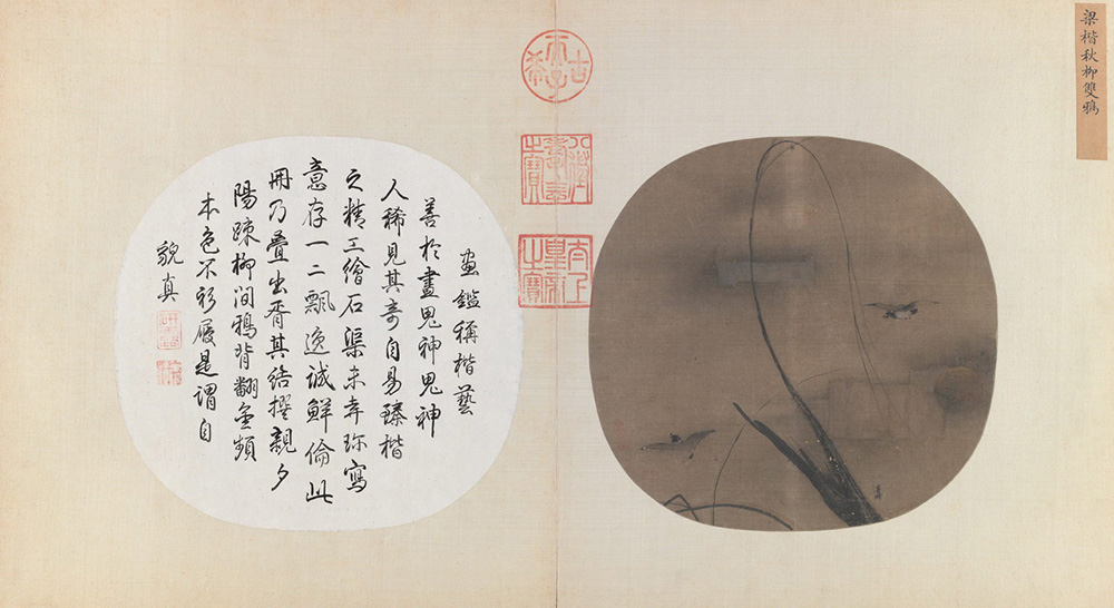 梁楷作画,以“减笔”闻名,此幅亦不例外,寥寥几笔就生动地勾画出所表现物象的主要特征,描绘出花鸟的内在神韵。大片的空白使画面显得空濛含蓄,给人以笔墨有尽而意无穷的想象空间,达到了“于无画处皆成妙境”的艺术效果。行书署款“梁楷”二字。此图前人定名《秋柳双鸦》,实则写唐代诗人王维五言绝句《鸟鸣涧》诗意。王维的诗“人闲桂花落,夜静春山空。月出惊山鸟,时鸣春涧中。”描绘鸟鸣涧春山月出的夜景,既幽静,又有生气。梁楷的画,以渴笔焦墨绘一节断裂的枯柳,三两根枝条昂扬向上又飘拂而下,突兀地将整幅扇页中分为二,构图大胆,以奇致胜。大片空白处淡墨晕染出的薄云满月,给空谷春山平添了几分神秘。初升的月亮惊起的两只山鸟奋飞呼鸣,打破了夜空的静寂,老柳虽然细弱,枝条却仍坚韧,使观者感受到自然生命的搏动。