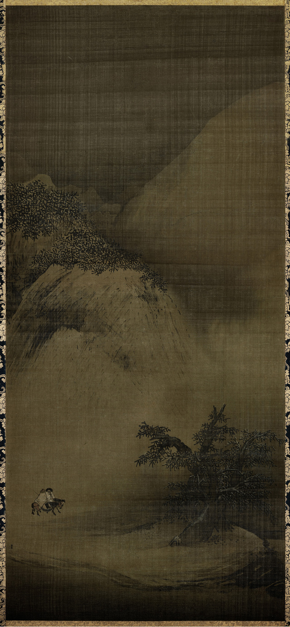 此件《雪景山水图》,款属梁楷,右上角有模糊的“杂华室印”,著录于能阿弥所纂,记载日本镰仓时期足利将军藏品的《御物御画目录》,证明其渡日时间不晚于能阿弥的卒年1471年。 此图为现存梁楷院体山水画中的代表作品,采用南宋院体山水常见的斜角构图,融合脱胎自北宋的巨幛式山水构图而绘成。