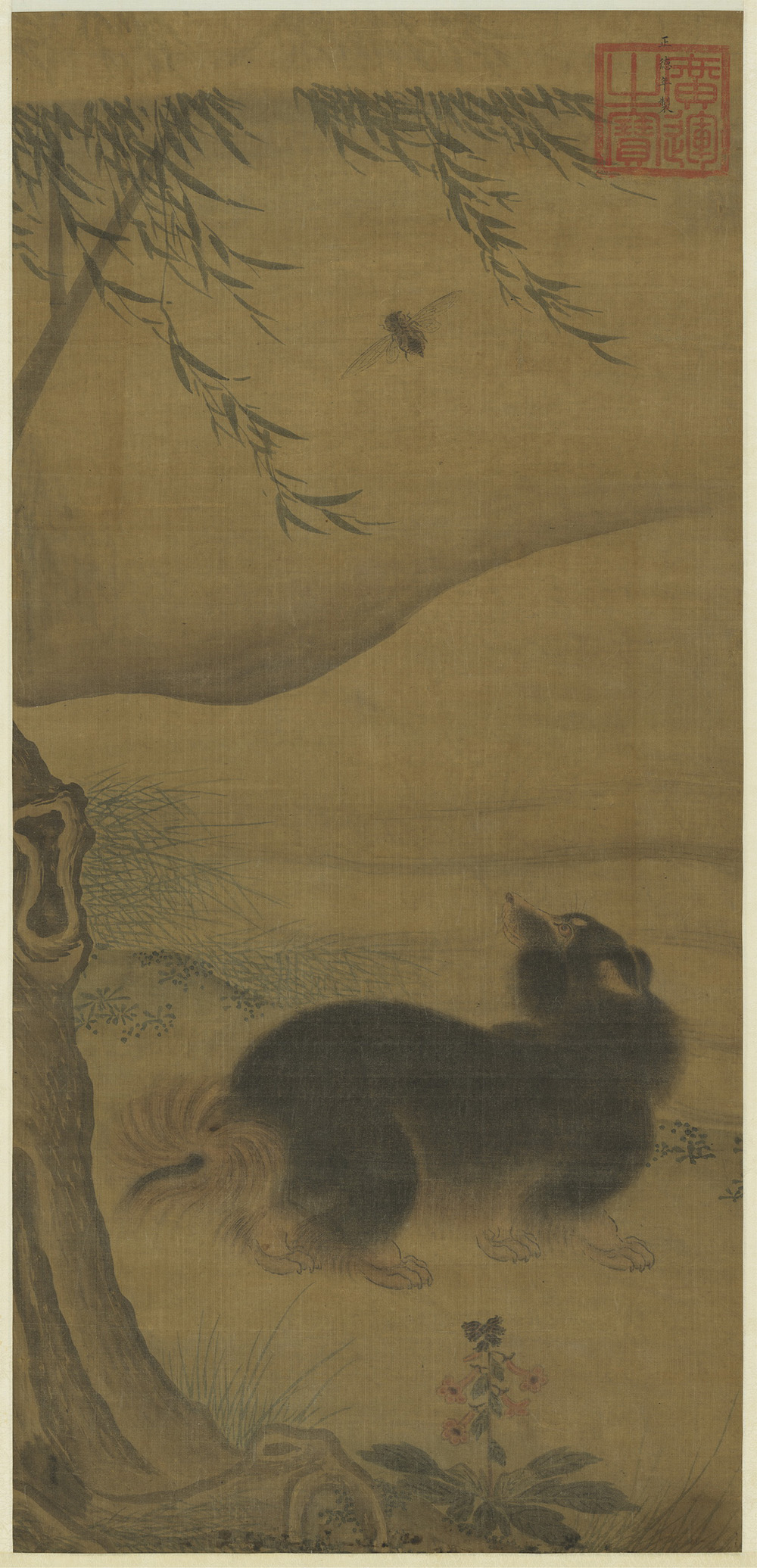 本画旧题为明武宗作,但是由树根底下的款字判断,其实应该出自李璈所绘。他是武宗正德时期的宫廷画家,详细的生平已经无从查考。这件立轴,可能是他存世唯一的作品。柳叶摇曳间,一只夏蝉兀自地迎风翱翔,蝉翼鼓动所发出的声响,似乎惊扰了路过的哈叭狗。只见它转头打量,仿佛想高叫一声,回吓一吓飞蝉。画面构图虽然简洁,不过却充满了戏剧张力,耐人玩味。