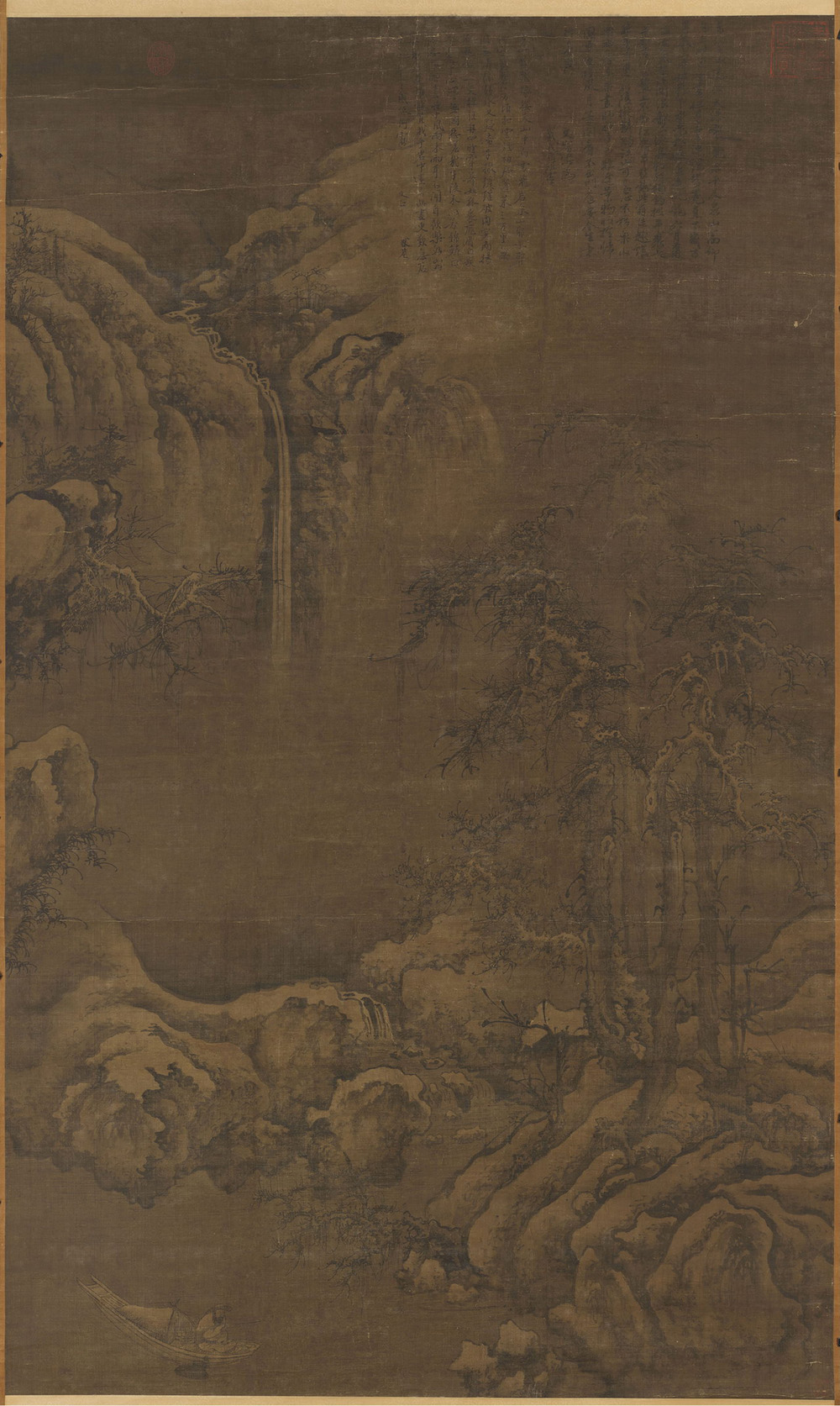 本幅画山泉从悬崖上奔泻而下,几株古松参差挺峙。白雪覆盖著大地,黝黑之中,显得天地沉阴,江流寒冻,而有一个渔人在寒江中独钓,善于形容寒意。山石皴染有如云状,圆浑厚重。用笔常扭转运行,速度颇快,甚为粗放活泼。渔翁、小船的用笔全中锋,细密稳健。由画风及题跋书风来看,推测为元人李郭派的作品。