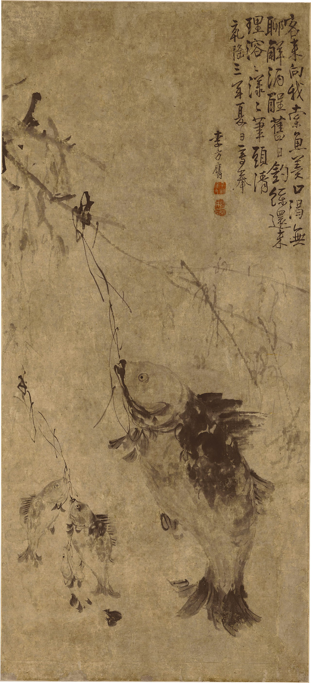题识:客来向我索鱼羹,口渴无聊解酒醒。旧日钓线还未理,溶溶漾漾笔头清。乾隆三年夏日写奉,李方膺。钤印:千秋渔父(白文)路旁井上(白文)