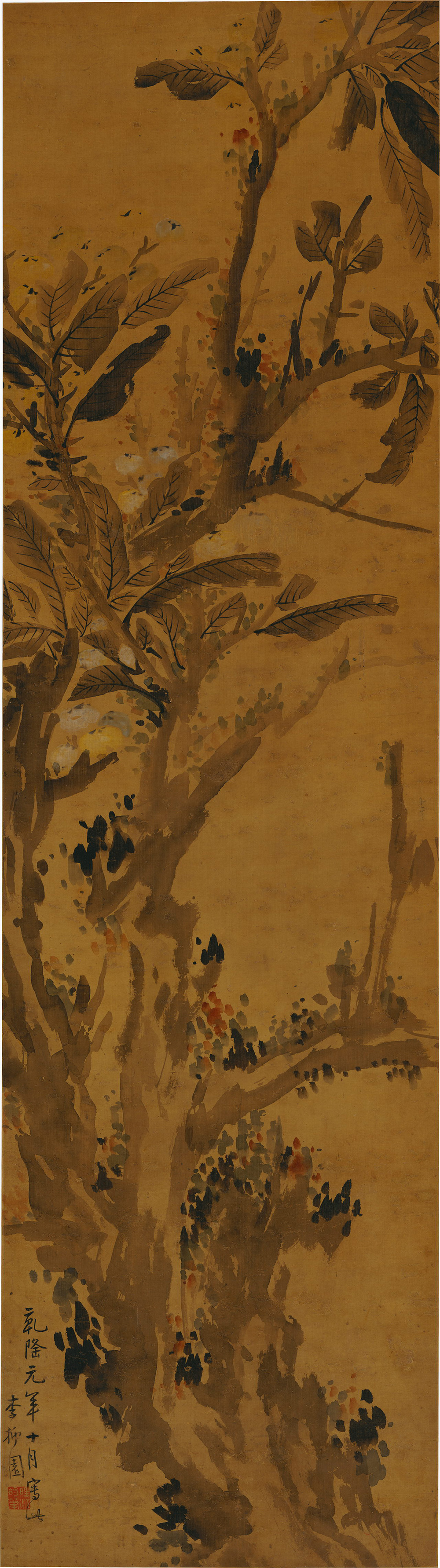 此幅绘粗枝疏叶的一树枇杷,点缀几丸金弹,用笔看似粗豪,实则匠心独具,把一棵枇杷树画得生机勃勃。
