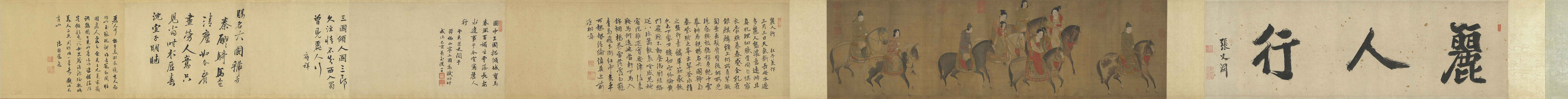 本幅根据杜甫《丽人行》一诗,描绘杨贵妃的姊姊虢国夫人等一行共九人,在初春时节骑马出游的情景。本幅无作者款印,后人或因李公麟擅画人马,便传称此作出自李公麟之手,但从画风来看,此画完成的时间当在南宋以后。
