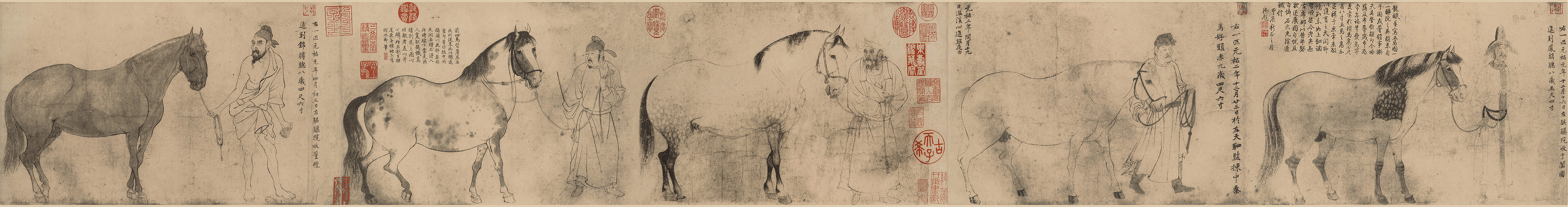 此图画的是宋朝元佑初年天驷监中的五匹西域名马,马旁各有一名奚官或圉人执辔引领。画中无作者款印,前4马后,各有黄庭坚签题的马名、产地、年岁、尺寸,卷末有黄庭坚“李公麟作”题跋:这些由西域诸国进贡的骏马,马名依序是“凤头骢”、“锦膊骢”、“好头赤”、“照夜白”,第五匹马佚名,经考证可能为“满川花”。画中的5位马官,两位是汉人,其余的为外族,形貌、服饰、神情各不相同,但在气质上却有着微妙的类似之处。