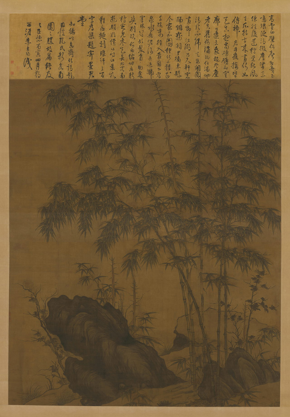 该幅图未署名款,钤印两方,已残缺,可见“李”、“息”字。诗塘有明代李东阳的小草题记,也为此画增色不少。