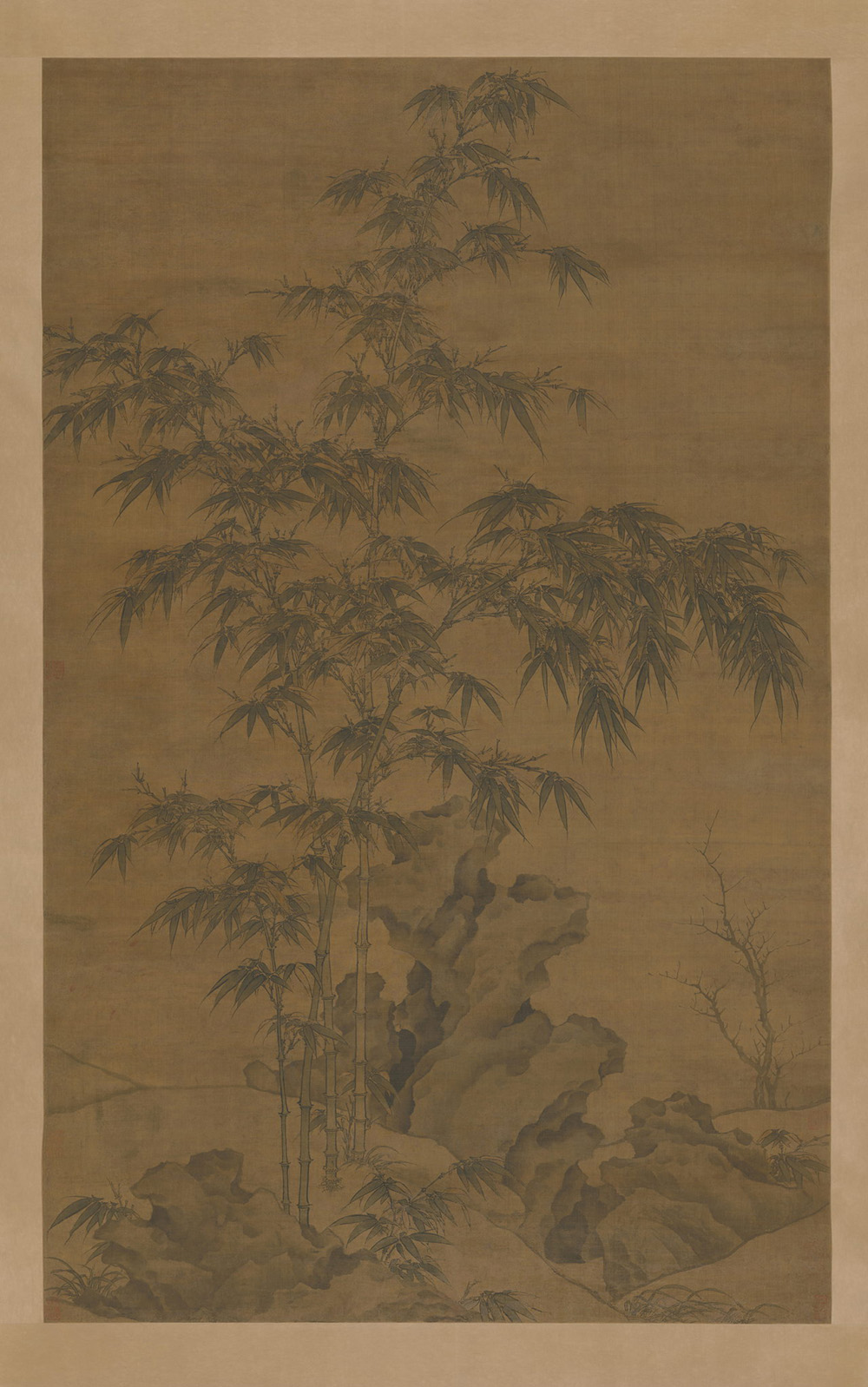 此图以双勾法画翠竹四株,相互交错,枝叶繁茂,左右纷披,昂抑错落,姿态隽美,生意盎然;再以湖石平坡、稚竹、枯木衬景。竹叶用墨色渲染,再略施淡汁绿,浓淡相间,阴阳向背,湖石用浓淡墨晕出立体感,玲珑多姿。构图匠心独具,笔法圆劲精工,设色淡雅,充分表现出了竹子那种“清高拔俗”的品格,为李氏双勾设色竹的代表作。