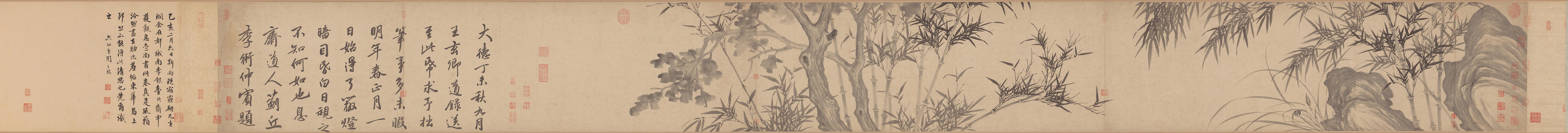 此图原为长卷,约在明代中期时被分割为前后两卷。前卷画慈竹、方竹各一丛,现藏美国堪萨斯纳尔逊·艾特金斯美术馆。这里所选藏故宫博物院的一段为后卷。图中所画兰、竹、石、梧名“四清”,意喻君子的高洁品性。此卷亦可分为前后两段,前段画二石、丛竹和兰,取由右向左的斜势,后段画二梧桐和丛竹。画家于物造型,以实为主,竹树皆节叶具备,兰石亦转叠多姿。画中枝叶虽密,但笔笔秀雅简洁,取形造势,不无顺畅。墨色浓淡相宜,变化自然。