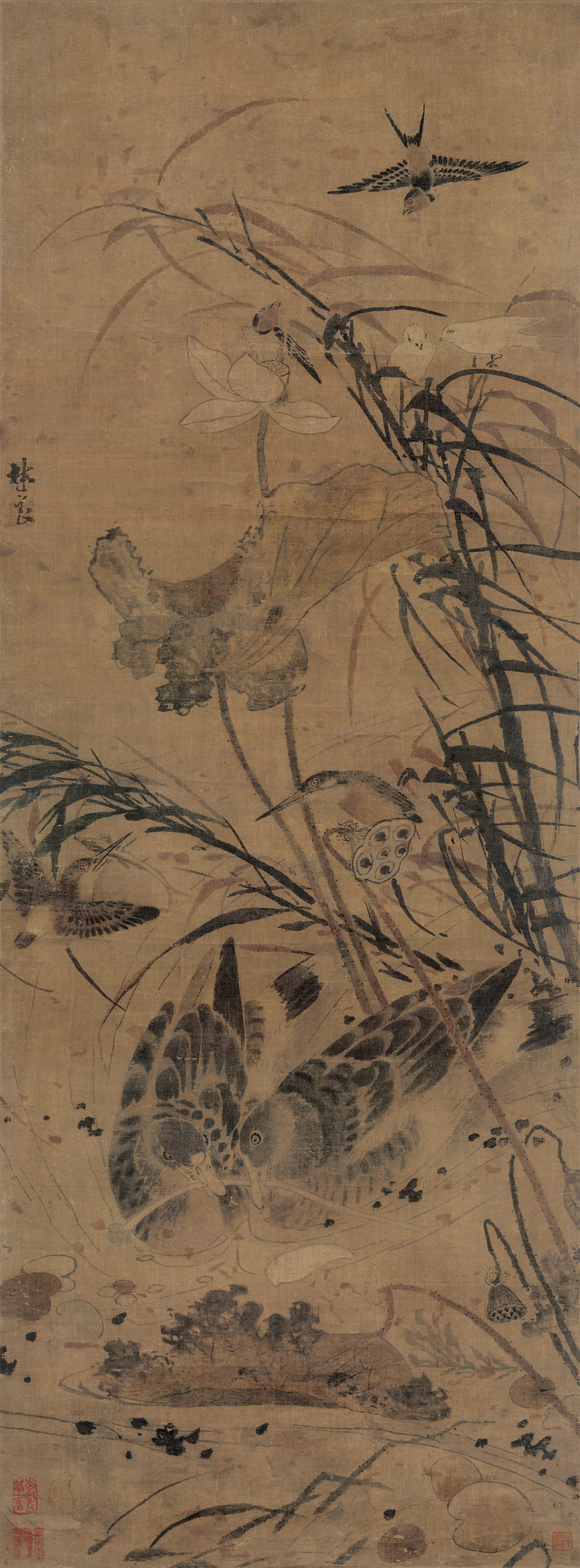 图绘荷塘一隅,草木向荣,鸳鸯嬉戏,鸟儿啄鱼,生机勃勃。水面上水波荡漾,水藻丛生。绿荷娉婷有致,芙蕖次第开放、结莲,呈现夏日晨曦,清幽阗静的境界。