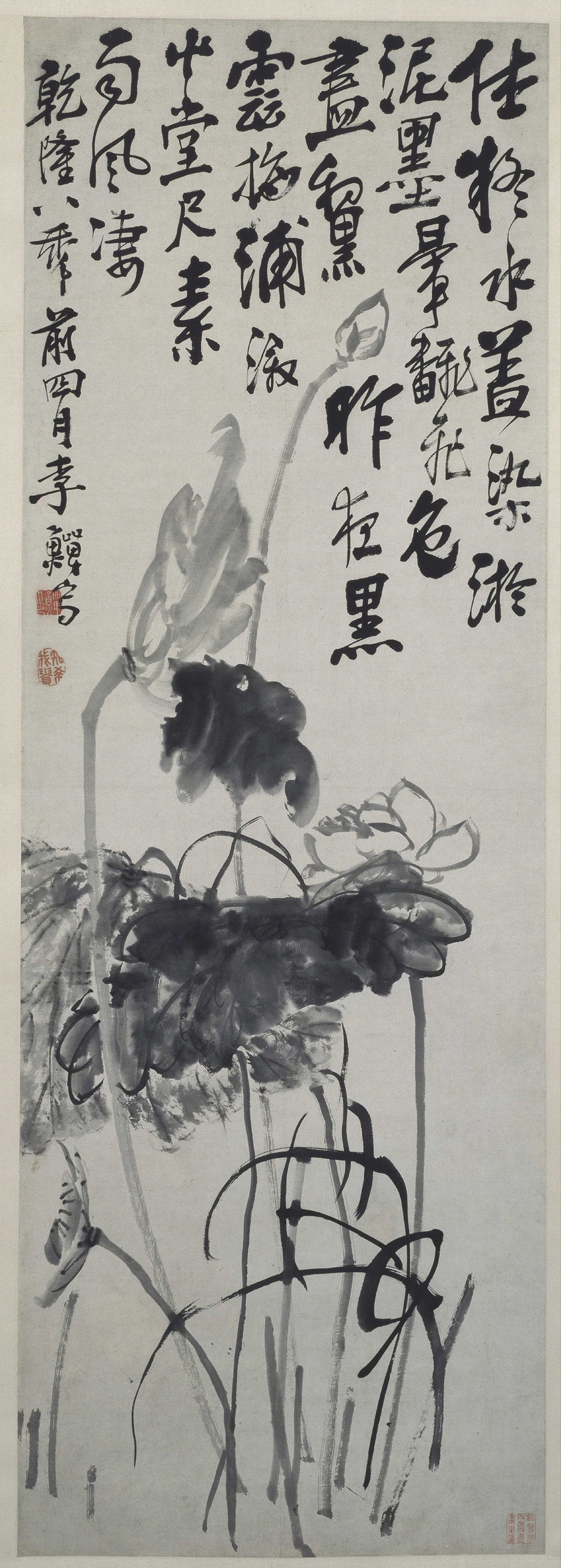 画上题七言绝句:“休疑水盖染淤泥,墨晕翻飞色尽黧。昨夜黑云梅浦溆,草堂尺素雨风凄。”款识:“乾隆八年前四月李鱓写。”自钤“鳝印”白文印、“知希我贵”朱文印。右下鉴藏印钤“松寥阁收藏书画之印”。乾隆八年为1743年。