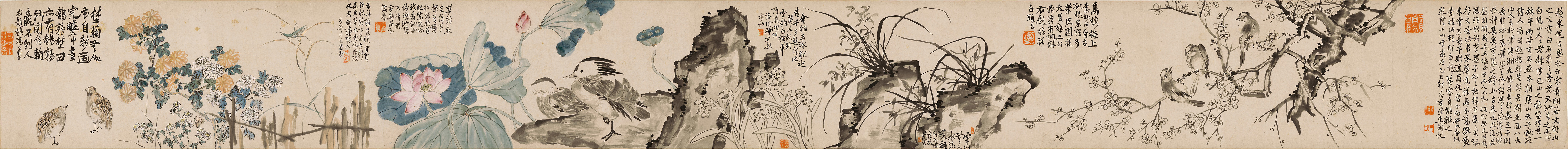 此卷是李复堂为硕衍学兄作花鸟长卷,分六部分:一梅花山鸟、二兰石、三水仙、四荷花鸳鸯、五草虫、六菊花。一一写意为之,并从宋之苏、米至清之石涛画法俱有议论,颇中肯綮。