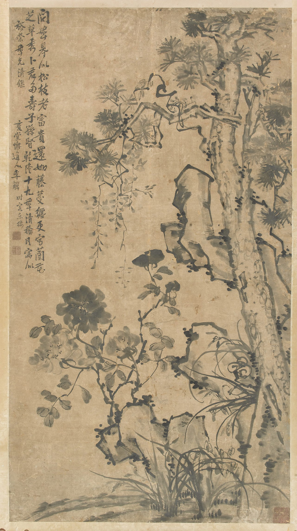 该作品的画面上,右下方用大笔触勾染出几块嶙峋之石,镇住全图的重心;石的缝隙间穿插有兰花、萱草和灵芝,精勾细描,姿态生动;石上方勾画的几枝红牡丹,在绿叶的衬托下偃仰有致,益显雍容富贵之态;石侧一株苍虬老松挺身直上,冲出画面之外,气势颇为雄壮;松干之上缠绕着赭色藤萝,松枝间则垂有紫藤花束,有“藤萝攀松,花发高枝”之意。