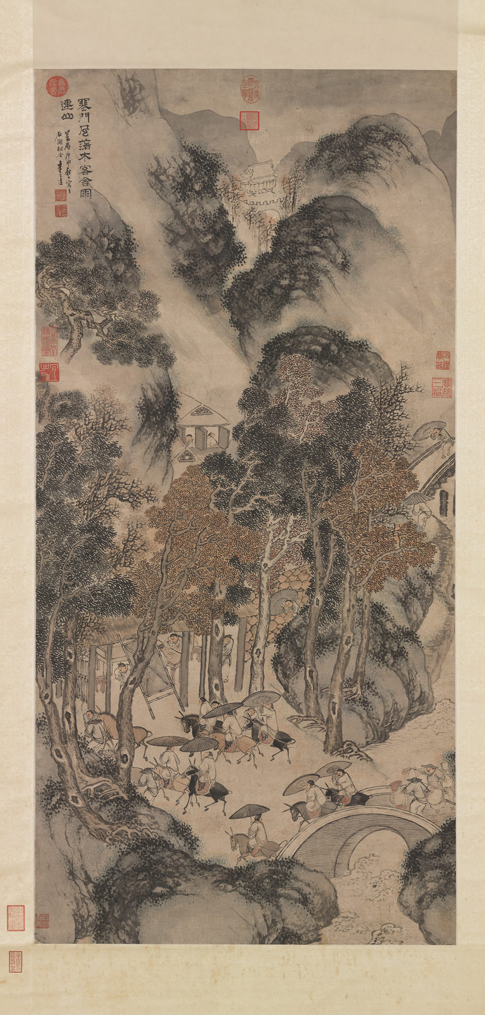 本幅描写荒山林峦中,风雨斜打,行旅撑伞,催促坐骑奔靠客店,店前则有伙计出迎。画幅视点集中于近景人物,亲切有趣。描写山峦,笔墨挥洒,淋漓尽致。题诗:「塞門風落木,客舍雨連山」出自杜甫秦州诗第十五首。