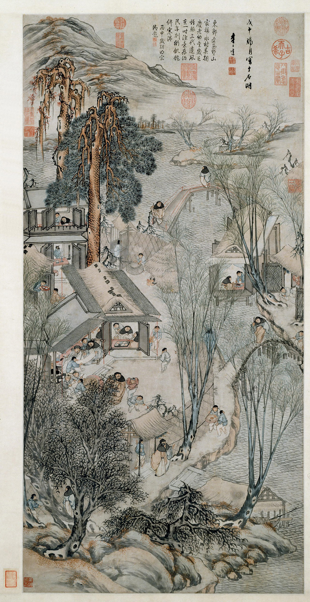 图画水村山郭,松屋柳溪,村中人家,长者访友宴饮,儿童燃放鞭炮,敲锣打鼓,辞旧迎新,欢庆佳节。所画山水、松柏笔墨苍劲滋润;所画人物用笔圆熟,无论老少,身姿各异,神态生动,每个人物形象皆具动感,全无刻板之姿。画面充满岁朝繁忙、喜庆的升平景象。画法严谨,笔法流畅娴熟。