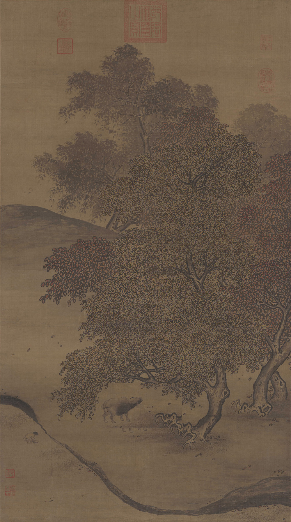 绘溪边平坡上大树数株,枝叶繁茂。树下一牛昂首长鸣,牧童在溪水中专心淘捉鱼虾。树干 和近处树叶以墨笔双勾填色绘制,远处以淡墨点叶。整图风 格近李唐一派。