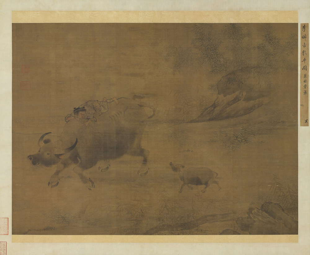 一位牧童趴伏于母牛背上,小牛跟随在后,引颈低呼,老牛摇尾相应,母子亲情,描写欲活。本幅并无作者款印,裱绫有清代鉴赏家梁清标所书之题籤,云:“李晞古乳牛图”。不过本幅牛体、皴石之用笔皆与李唐(西元1049-1130年)画风有别,或属明代早期之作。