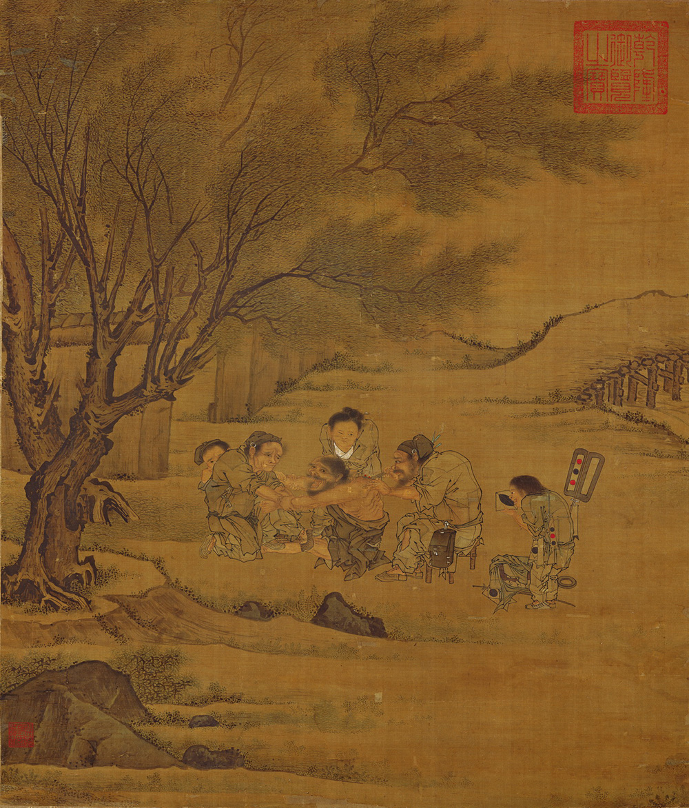 此幅画行脚医生治病情形。病人龇牙咧嘴痛苦难耐,医生正设法以炙艾法将其脓引出。在画家巧妙的安排下,每个人物皆有出色的演出。本幅的衣纹以中锋细劲之笔,即是所谓的「钉头鼠尾」的描法,表现出乡村百姓粗布衣裳的质感。在六人稍嫌夸张、诙谐的神态下,将乡间生活描绘得栩栩如生。〈炙艾图〉在用笔用色承袭宋代写实风格,是南宋院画中写实风俗画中之杰作。