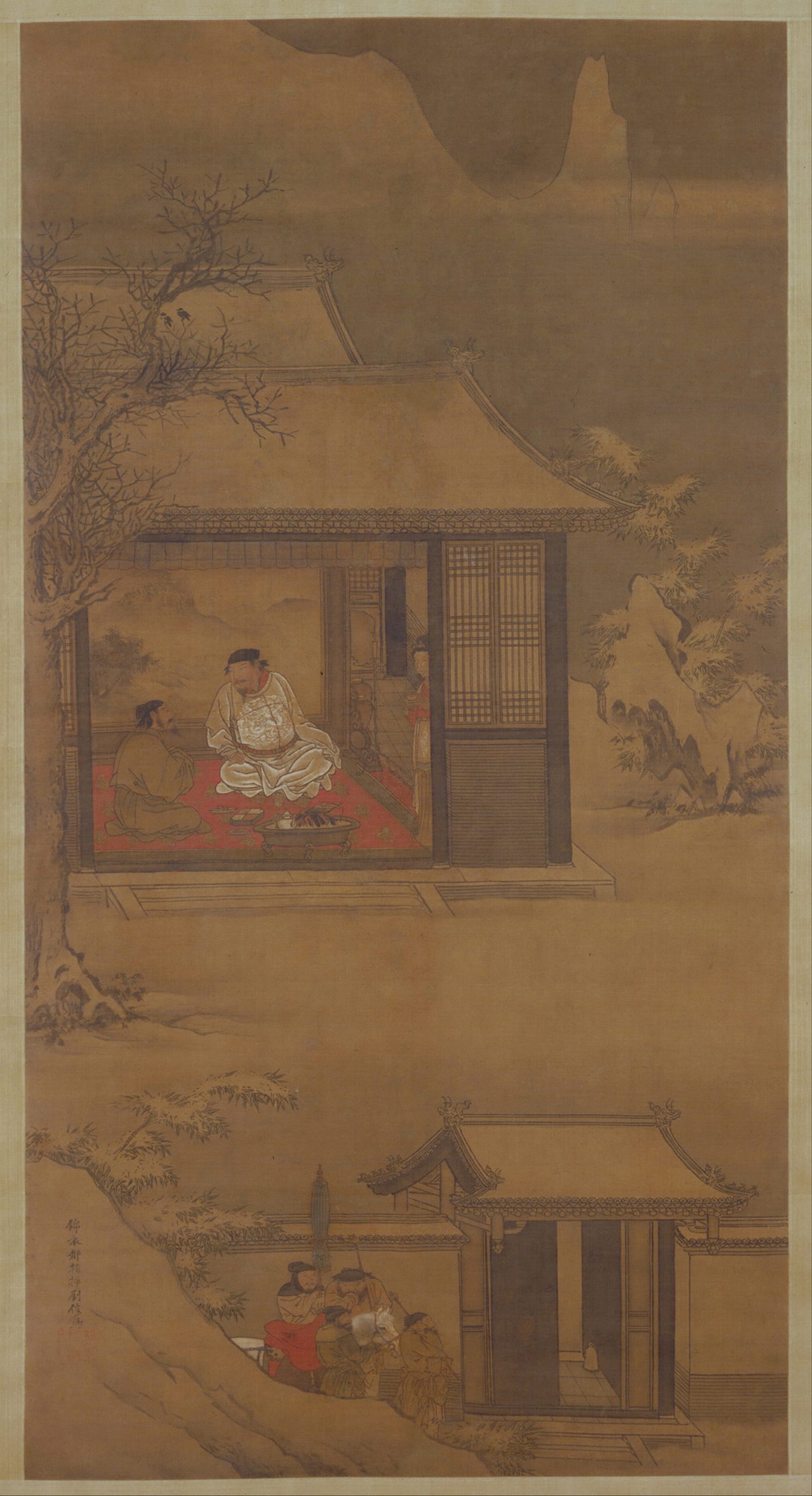 此图描写宋太祖赵匡胤雪夜访赵普的历史故事。据《宋史·赵普本传》记载:“太祖数微行过功臣家,普每退朝,不敢便衣冠。一日,大雪问夜,普意帝不出。久之,闻叩门声,普亟出,帝立风雪中,普惶惧迎拜,帝曰:‘已约晋王矣。’已而太宗至,设重裀地坐堂中,炽炭烧肉,普妻行酒,帝以嫂呼之。因与普计下太原。”画面描绘的正是这一历史情景。在门庭宽敞、屋宇数重的枢密副史府内,前厅正中二人围炉而坐。上首坐的是宋太祖赵匡胤,他头扎巾帽,身穿盘领窄袖袍服,腰束锦带,身材魁伟,气度不凡,其庄严的表情,侧首聆听的姿态,恰当地表现了深夜访贤、商议国家大事的仪态和心境。身着便服的枢密副史赵普在下首侧坐,恭谦地侃侃而谈,细致地刻画出了他诚恳献策的谋臣风度。画家在着意刻画主体人物的同时,对景象做了细致的描写。近岩远山,老树昏鸦,均被夜色笼罩着,竹叶、树枝、屋脊上覆盖着皑皑白雪,天气显然很寒冷。为突出赵匡胤的天子身份,在大门外象征性地画有四个侍卫,他们似乎守候已久。这些细微的描绘,深化了雪夜访贤的主题。