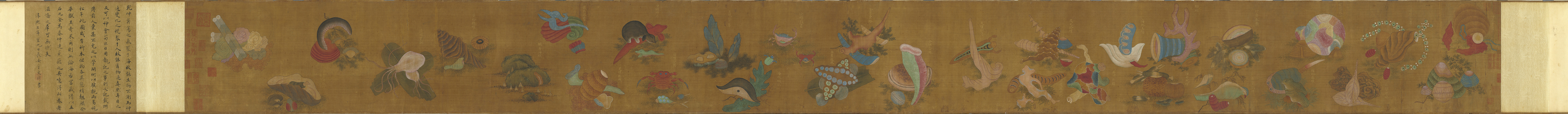 画卷以艳丽的色彩表现画家所了解或臆想的海洋生物,描绘了蚌蛤、螺贝、海龟、海猪、蟹、鲎、珊瑚等三十一种。每种右侧用金粉书写四字题名,如:海蓑云月、合擎蚌蛤、云球簇海、海际玉蟾、海猪拜月、玉芝翠管等等。