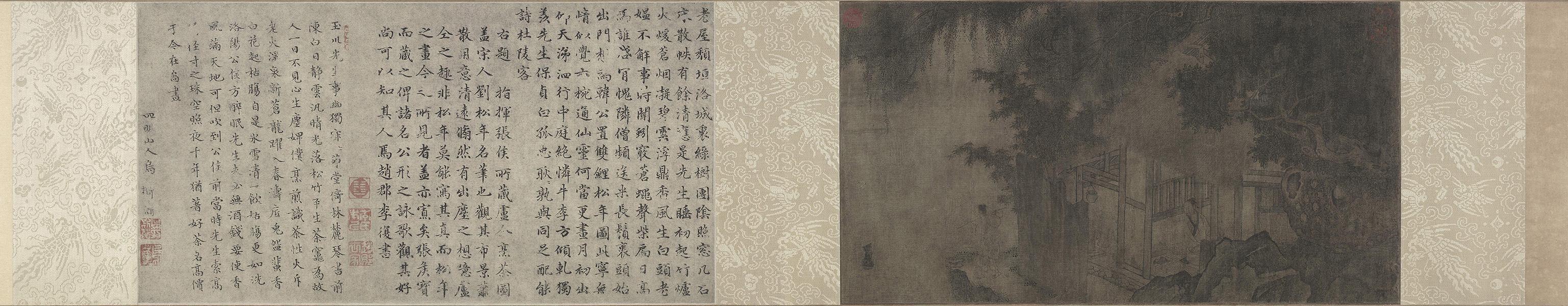 画山石瘦削,有松槐生石罅,下覆茅屋。卢仝拥书坐,赤脚。婢治茶具,长须奴肩壶汲泉。款落刘松年,蝇头小楷,署在松节。后幅有唐寅跋:“右玉川子烹茶图,乃宋刘松年作。玉川子豪宕放逸,傲睨一世,甘心数间之破屋,而独变怪鬼神于诗。观其《茶歌》一章,其平生宿抱忧世超物之志,洞然于几语之间,读之者可想见其人矣。松年复绘为图,其亦景行高风,而将以自企也。夫玉川子之向,洛阳人不知也,独昌黎知之。去昌黎数百年,知之者复寒矣。而松年温之,亦不可不为之遭也。予观是图于石湖卢臬副第,喜其败炉故鼎、添火候鸣之状宛然在目,非松年其能握笔乎书此以俟具法眼者。唐寅。”