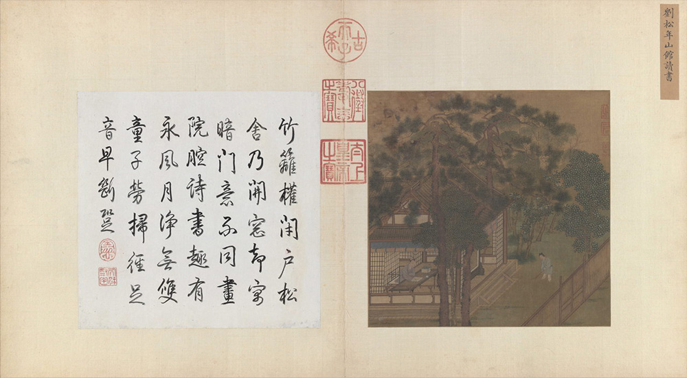 描绘的是文人雅士所向往的闲适生活。长松掩映之下,长案临窗,清风徐来,窗外传来书童打扫落叶的声音,间或闻得几声鸟鸣,宁静悠闲,倚案展卷,何等惬意。对幅乾隆皇帝题诗:“竹篱权闭户,松舍乃开窗,却寓暗门意。不同画院腔,诗书趣有永,风月浄无双,童子劳扫径,足音早断跫。”骑缝钤有乾隆皇帝“古稀天子”、“八征耄念之宝”、“太上皇帝之宝”鉴藏印。