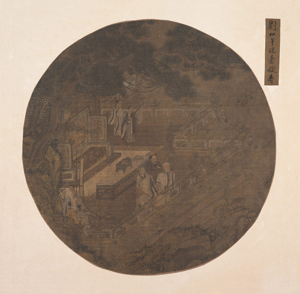 画上无名款,因其画风技法与刘松年相仿,故旧题刘松年作。此画描绘的是众仙瑶台献寿的景象。三位献寿的仙君居于画面中央作揖遥拜,四周围栏陈设工整繁复用界画方式表现。画中人物神态各异全凭不同形状的点睛之笔,衣褶勾勒以“兰叶描”为之,树石画法属“刮铁皴”之类。全画设色古雅,以淡墨细染物象之阴阳,后略施淡彩,唯有须眉衣襟处渲染重墨。细看画中案几坐具,方寸之间花纹图案纤毫毕现,整体而观又无琐屑之弊,是宋代小品画中的佳构。