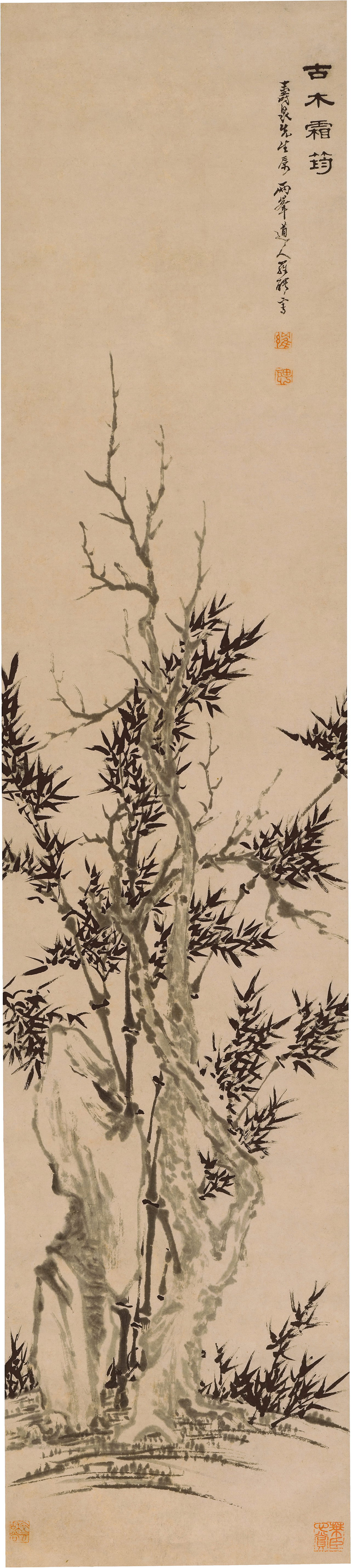 自跋:古木霜筠,寿泉先生属两峰道人罗聘写。