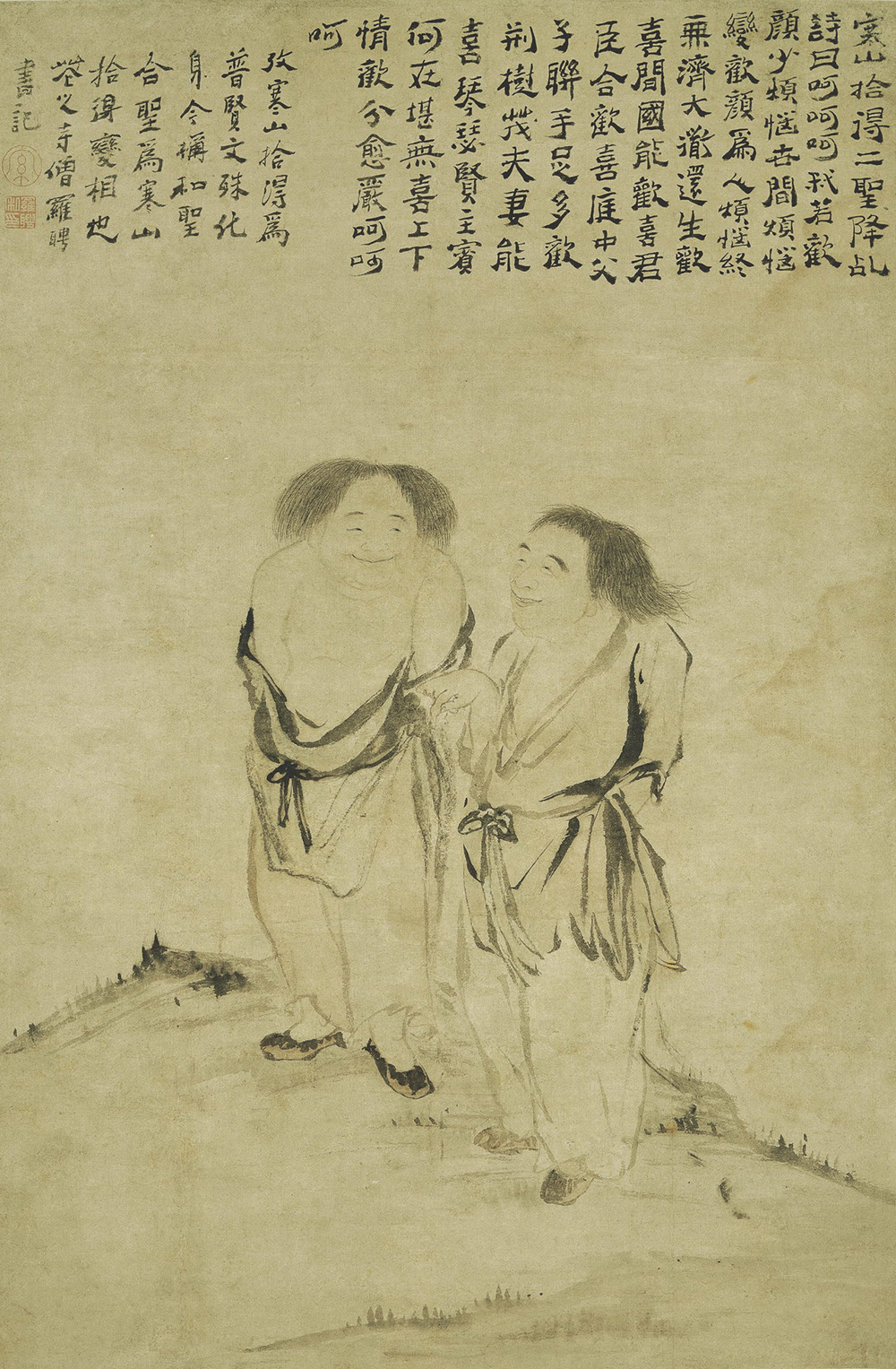 此幅绘寒山、拾得二人立于山岗之上,谈笑风生,皆作世俗之态而深具禅意。