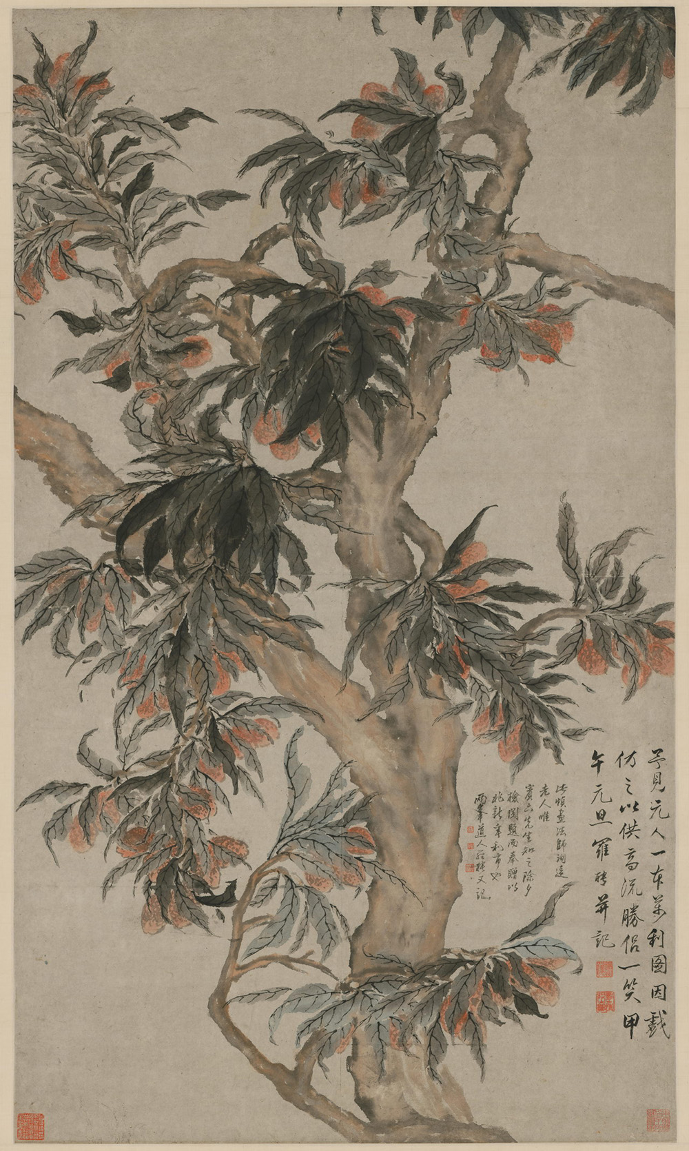 画面是劲风吹拂的荔枝树梢挂满熟透的果实,荔枝色泽腥红,枝干与叶片以重墨写意,造型动感而富于生机,色彩鲜艳明快又不失深沉苍润,注入了作者深厚的情感,大写意的思想和实践能力已于此图初现端倪。这是一幅作者模仿前人笔意绘制的“一本万利图”,一树,代表着一本,荔枝树上多多的荔枝,代表万荔,谐音“一本万利”。