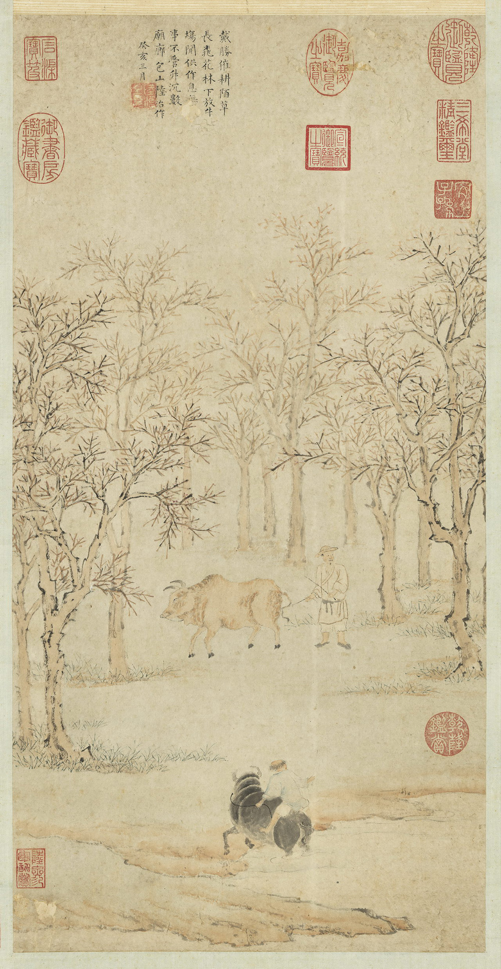 明嘉靖四十二年绘,此图描绘桃花林下,放牧双牛,一牛甫自塘中起身登岸,一牛正踯躇林间。全幅以浅赭色为基调,画面显得极为柔和。人树坡陀,笔触清淡,流露出明代吴派文人画气息。