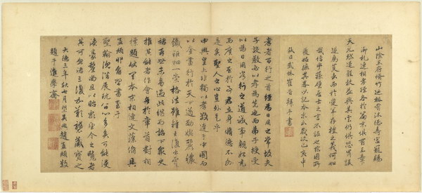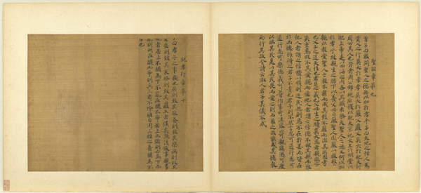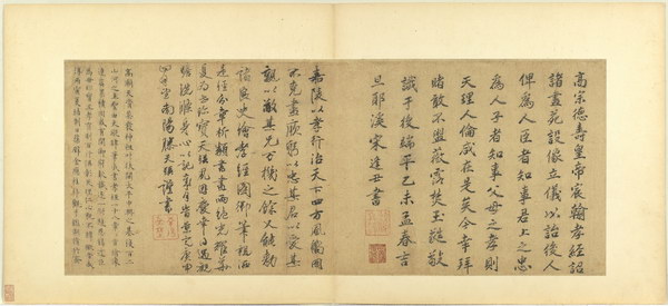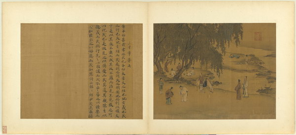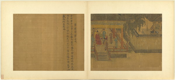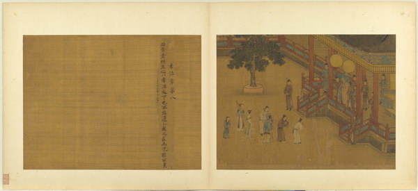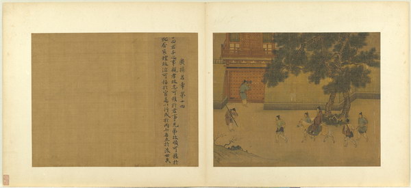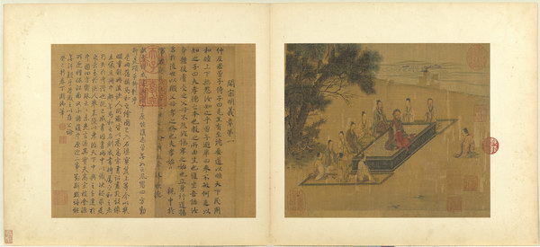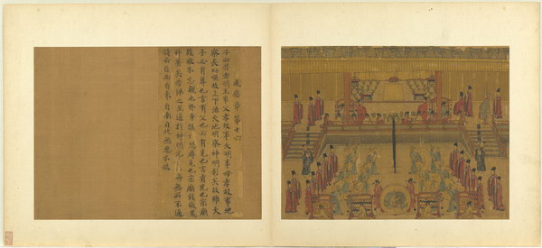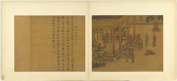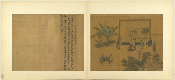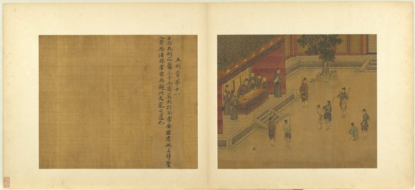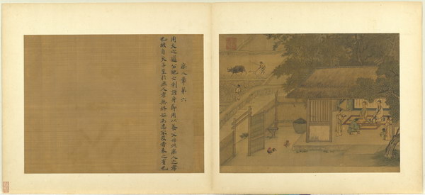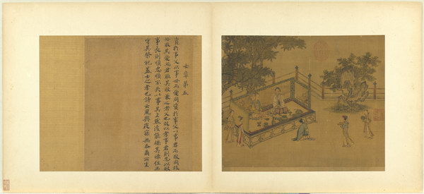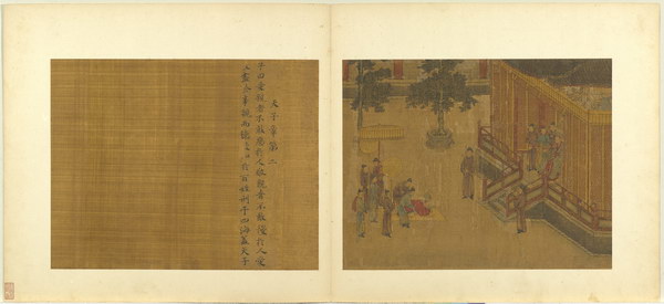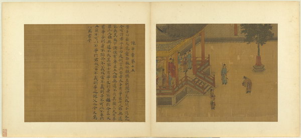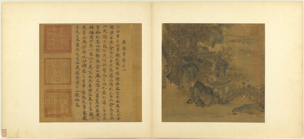《孝经图册》(题宋高宗书孝经马和之绘图)原本应为图文相连的长卷,后来因破损严重,改装成书画分开的册页形式。画幅各藉不同场景,诠释各阶层人士尽孝及忠君的双重意涵。图文相辅,充分突显了 “为君主立言” 的创作初衷。
