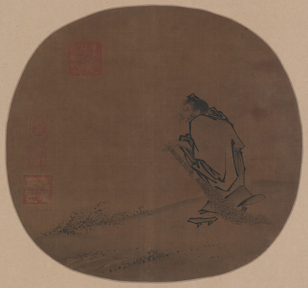 描绘了唐代僧人寒山子持帚行于山中的场景。寒山子的头部、手部以细笔描绘,衣饰则用刚健有力的钉头鼠尾描,整体生动地刻画出寒山子桦巾木屐、布衣长袍、手持扫帚、神情愉悦的形象,或许有着扫除忧愁,获得自由的寓意。