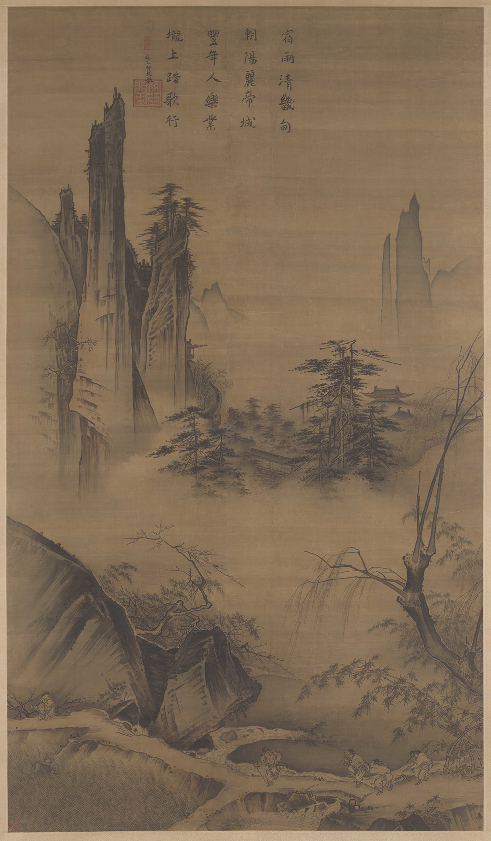 雨后天晴的京城郊外景色,同时也反映出丰收之年,农民在田埂上踏歌而行的欢乐情景。雨后天霁,空气清澄,山明云净,花鲜柳翠,春禾兴旺,溪水奔流,几个乡人预感丰收在望,酒足饭饱,在田垄上欢声笑语,踏歌而行,好一派明快轻松、生机蓬勃的景象。