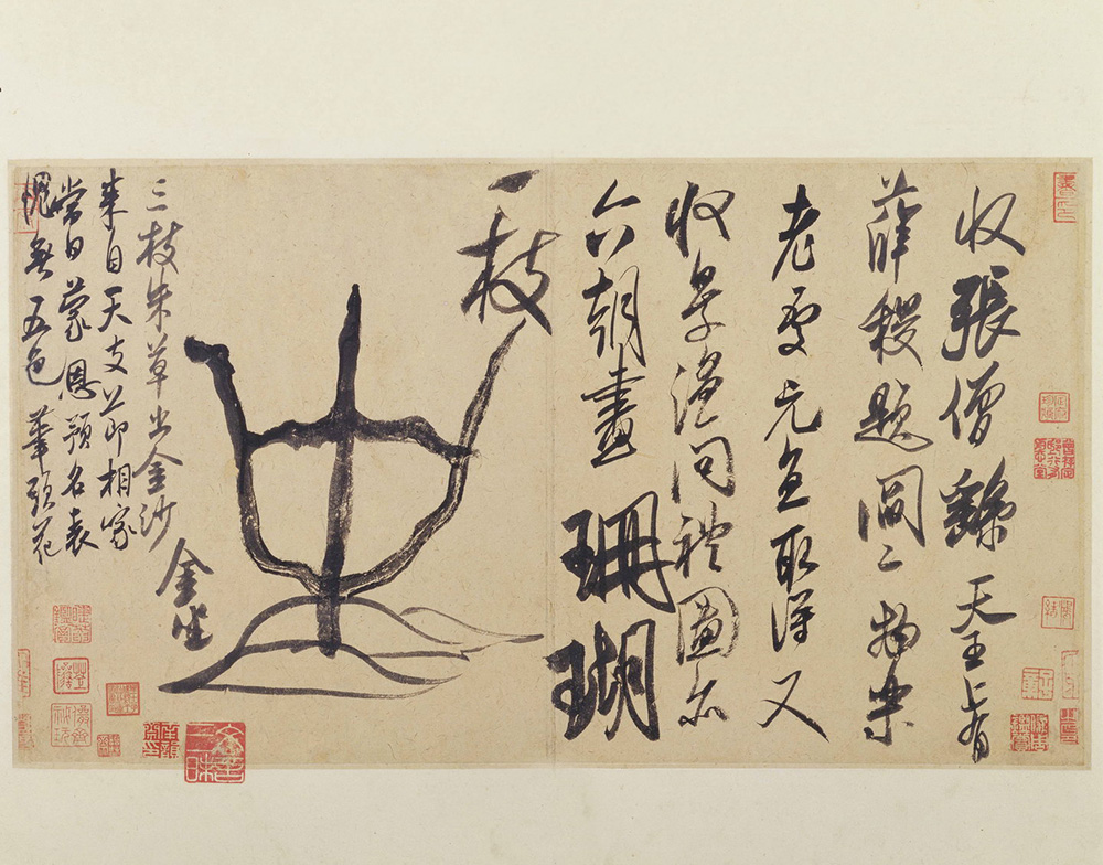 此帖是米芾与人谈论收藏情况的一封书信。用笔纵逸迅疾,随心所欲而不逾矩,充分表现了他放达的个性与深湛的功力。信中言及珊瑚笔架即随手插图一幅,可谓神来之笔,此也是米芾唯一的传世画迹。鉴藏印记:“内府书印”(半印)“大雅(半印)”“文言三昧”,“定府珍藏”“曾存定邸行有恒堂”“睫庵鉴赏”以及梁清标、王鸿绪、安岐、永瑆诒晋斋、绵亿南韵斋诸印。