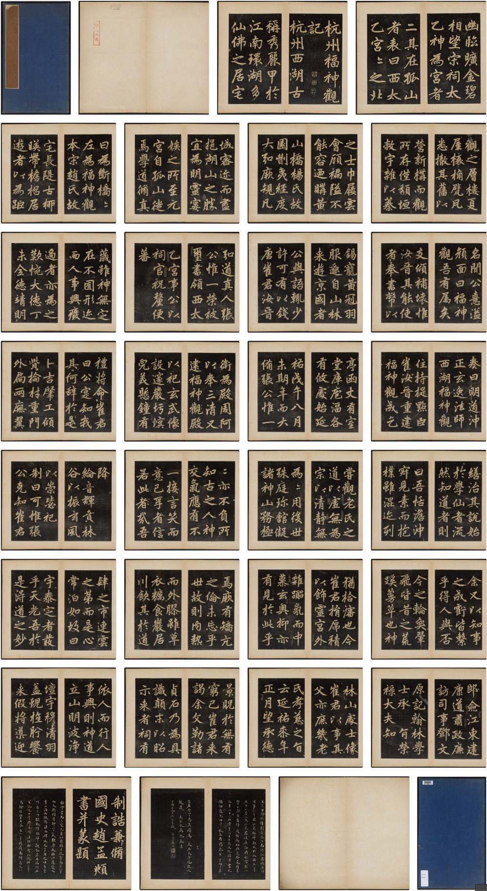 《杭州福神观记》是一篇碑记,由著名文学家邓文原撰文,记述道教领袖张惟一委派崔汝晋重建位于西湖断桥之侧的福神观之始末。赵孟頫书此碑记于元延祐七年(1320年),时已67岁,属其极晚年作品,已臻“人书俱老,炉火纯青”的境界。作品以乌丝界栏。字体主要取法唐代李邕,参以己意,雄健开张,用笔圆劲浑厚。全文七百余字一气呵成,功力非凡。当年应曾上石,今碑已佚,唯此墨迹存世。卷后有清吴荣光、周寿昌、杨岘题跋。