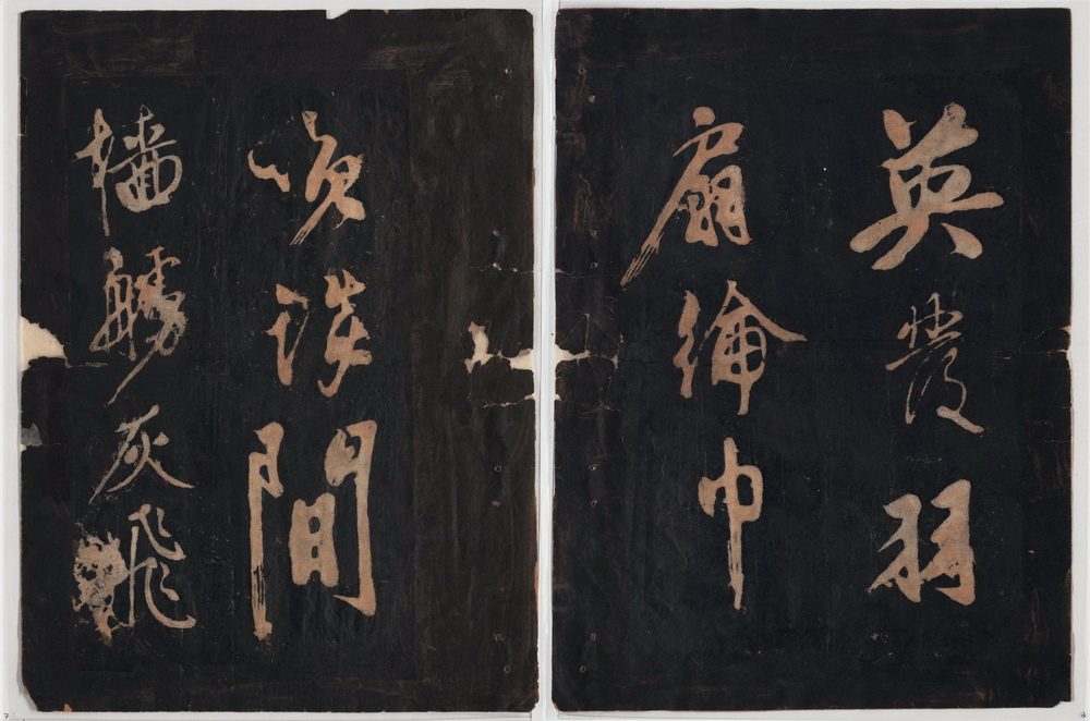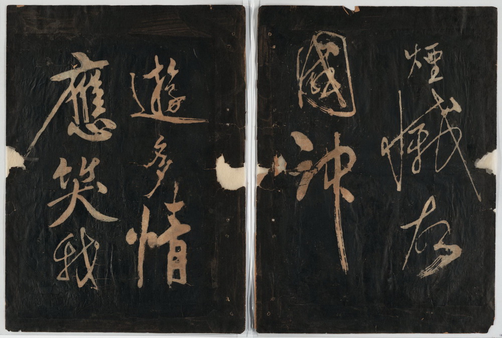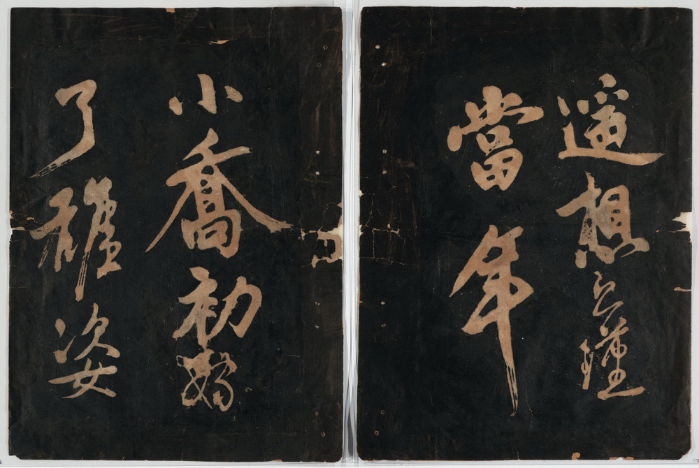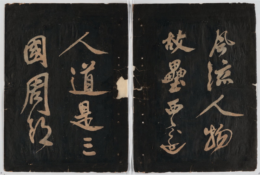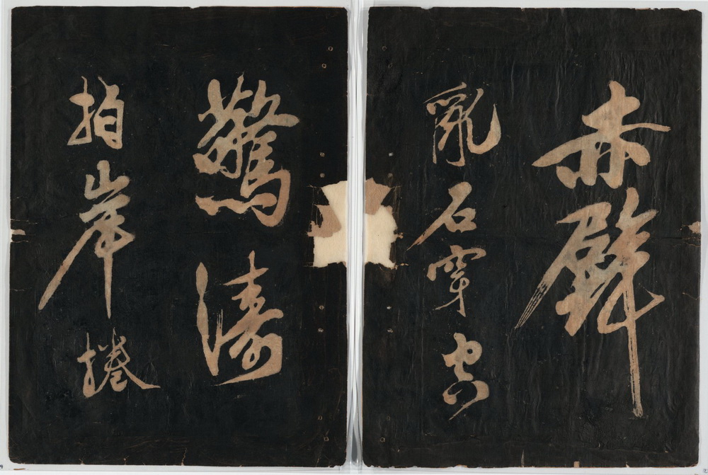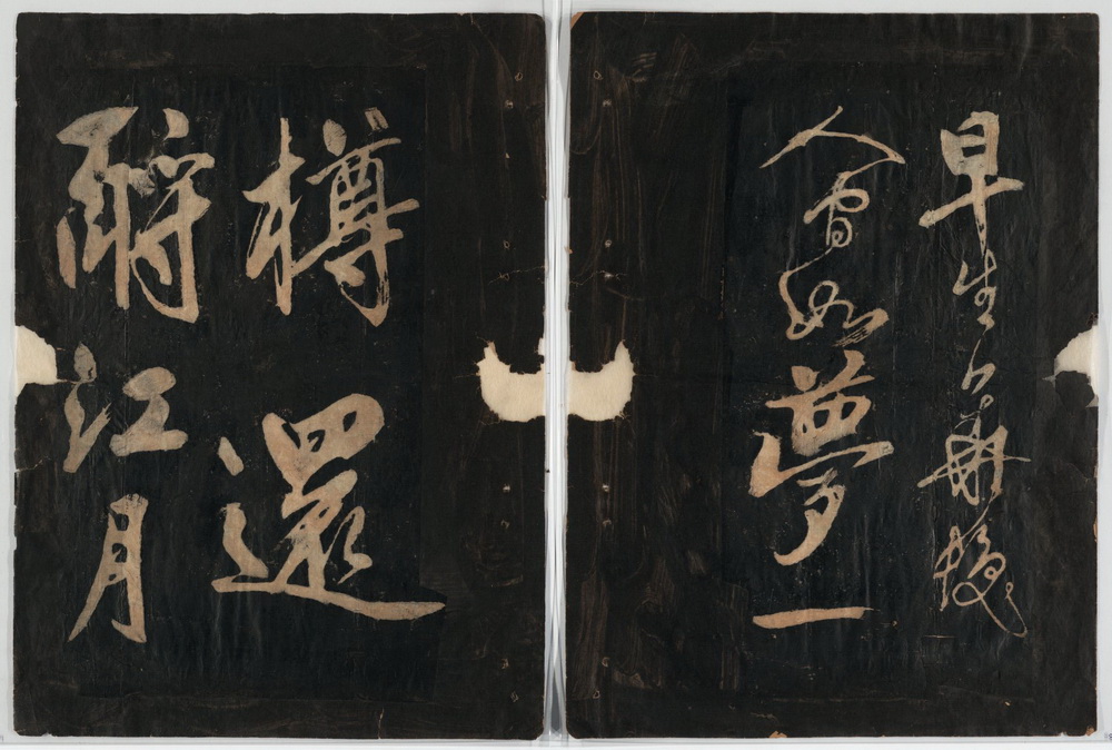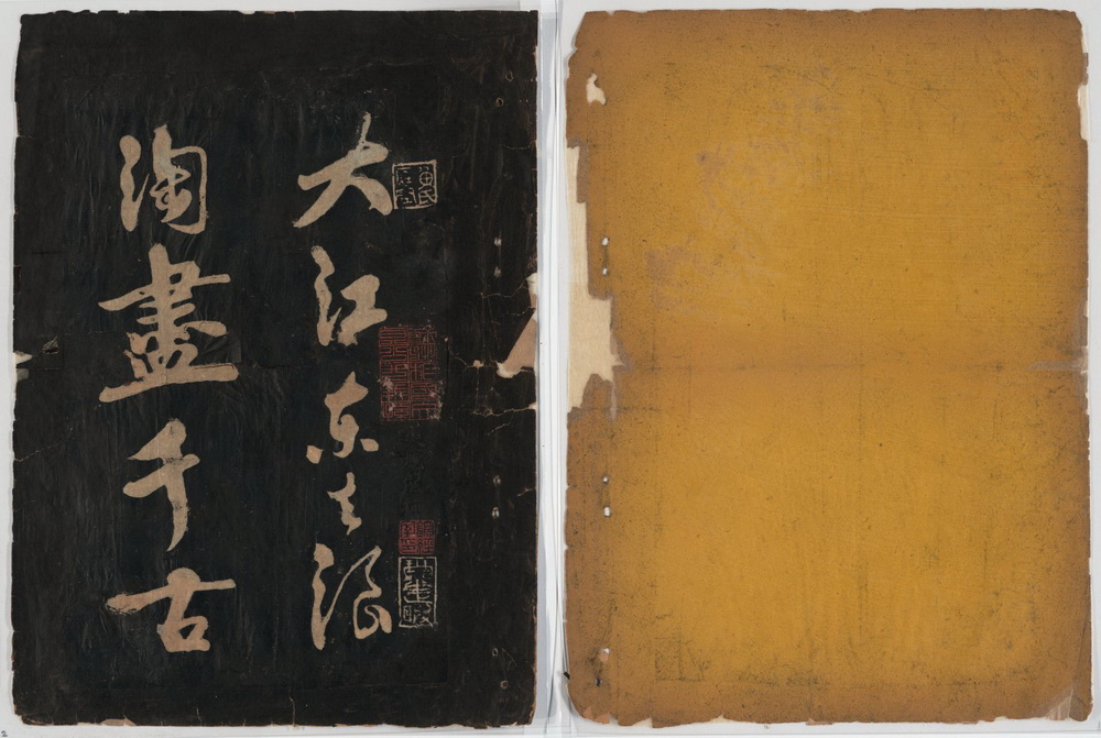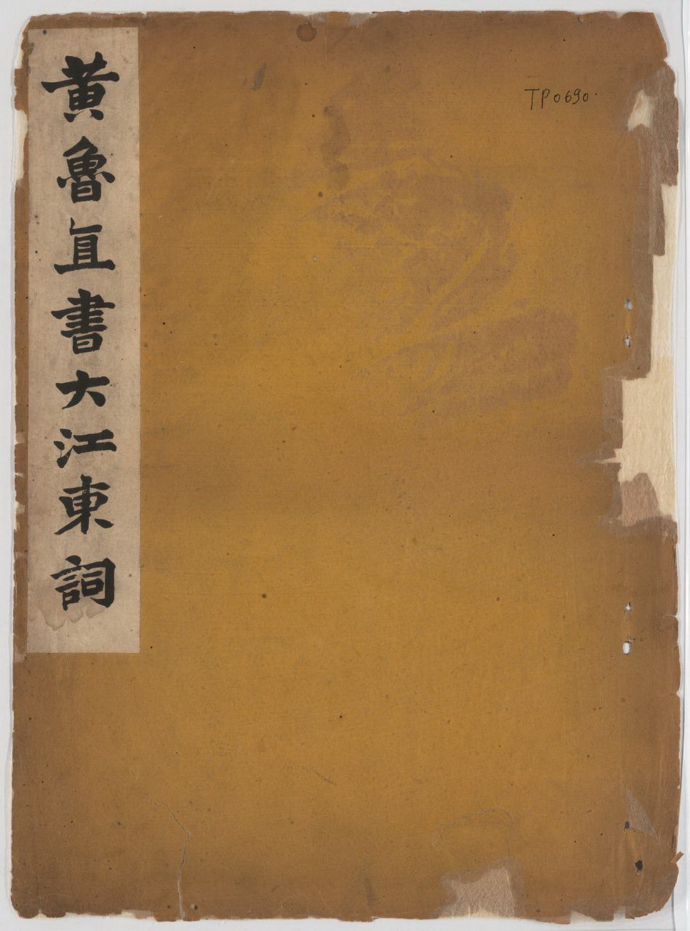 《黄鲁直书大江东词》拓本,赤壁怀古,民国拓本,苏轼撰,黄庭坚书。黄庭坚书写的苏轼(东坡)词《念奴娇·赤壁怀古》原石藏于山东省嘉祥县的武氏墓群石刻博物馆,全文共四块石刻,每块刻石均长方形,按石刻拓片每块约高 35cm、宽101cm。此帖书风基本符合黄庭坚的行草风格,但有点过头,失之随意,有些字显得俗气,很难说是一件真迹,也很有可能是后人伪作,还请书友们认真辨别。不过,以黄庭坚的长枪大戟去写苏东坡的大江东去,还真是很契合、很绝妙。