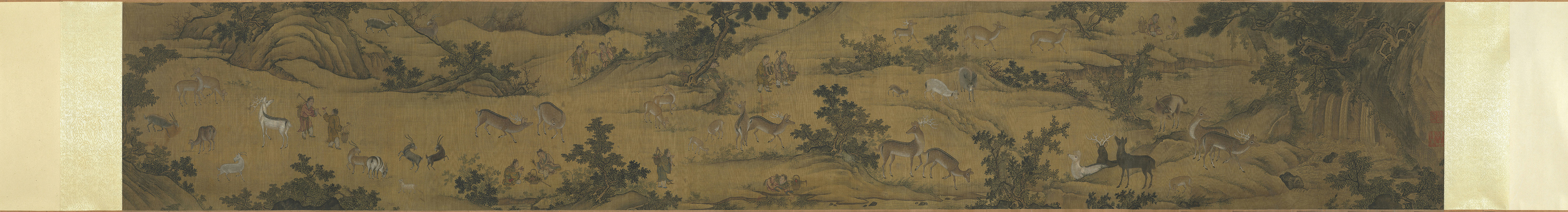 无名款,画卷描绘了山峦叠嶂、瀑布溪流的景象,松石掩映的岸边,群鹿或奔跑嬉戏,或觅食小憩,各有神态。其中,几组采芝童子肩披叶裳,手提竹篓,负锄行走于山间。整幅画充满吉祥的寓意。鹿在我国古代被认为是长寿之仙兽,鹿与禄谐音,寓意吉祥,是相当受欢迎的画题。故题名「百祿」钤印:嘉慶御覽之寶、宜思恭印、清白傳家。