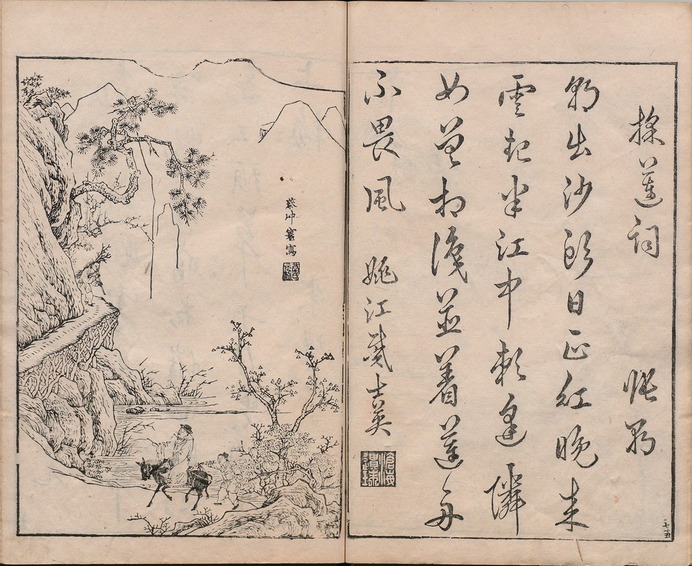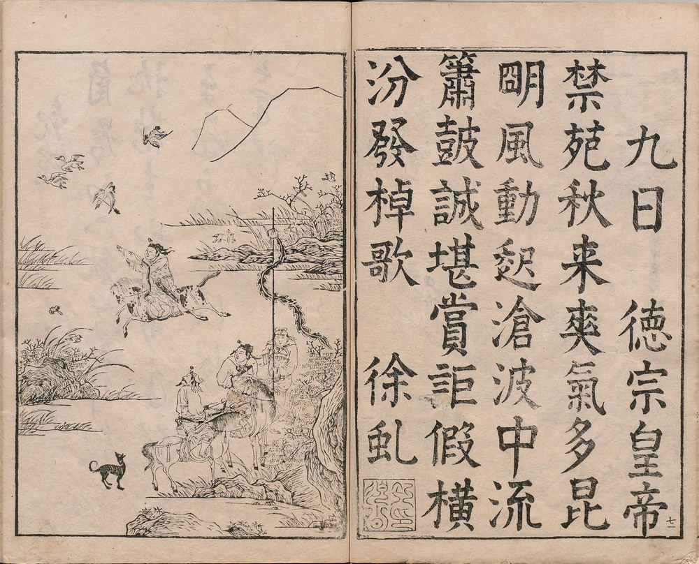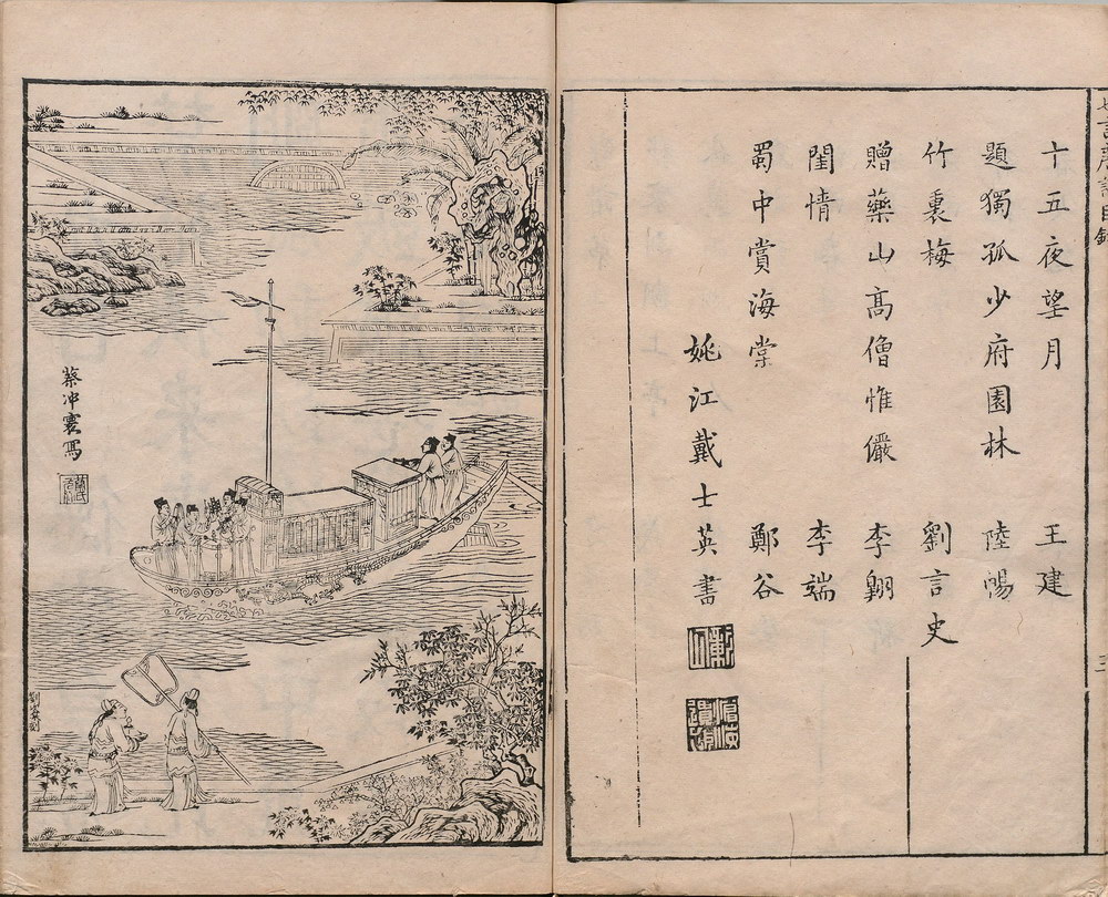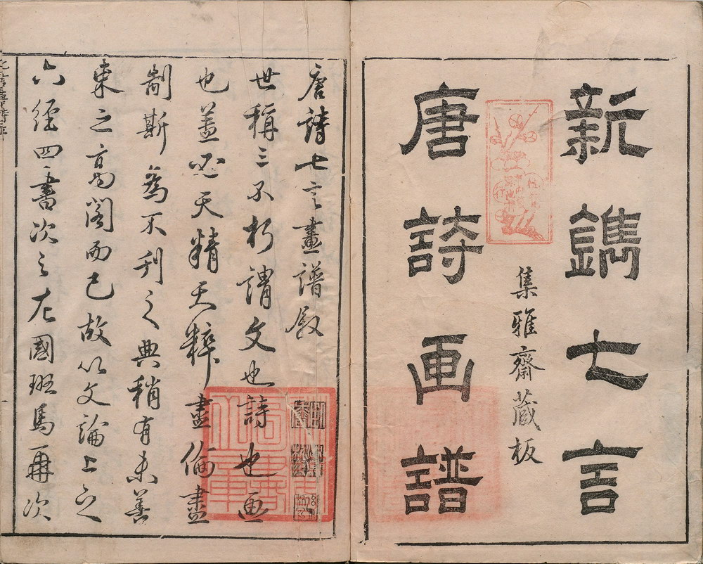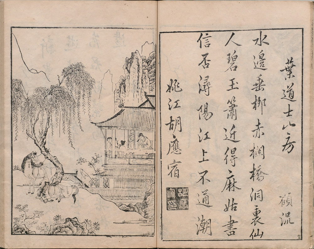 《唐诗画谱》由明代集雅斋主人黄凤池编辑,为诗、书、画三美合一的版画图谱,是徽派版画代表作之一。