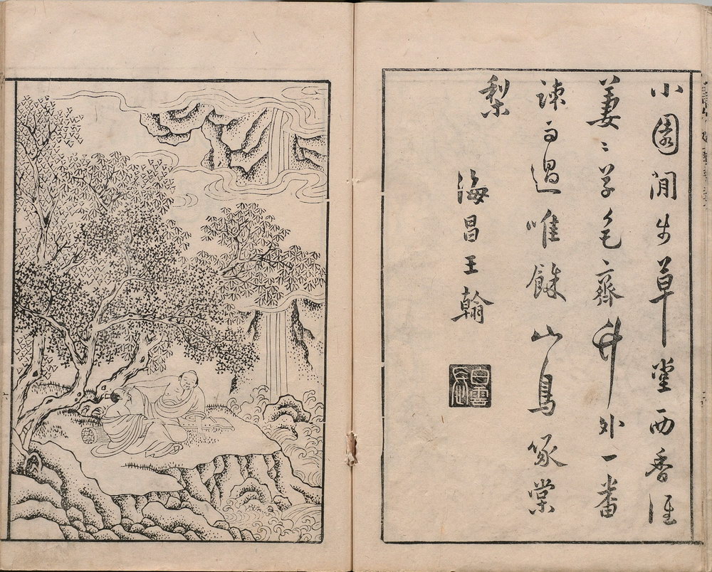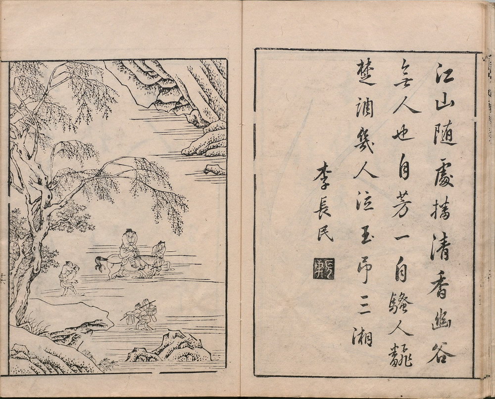 《唐诗画谱》由明代集雅斋主人黄凤池编辑,为诗、书、画三美合一的版画图谱,是徽派版画代表作之一。