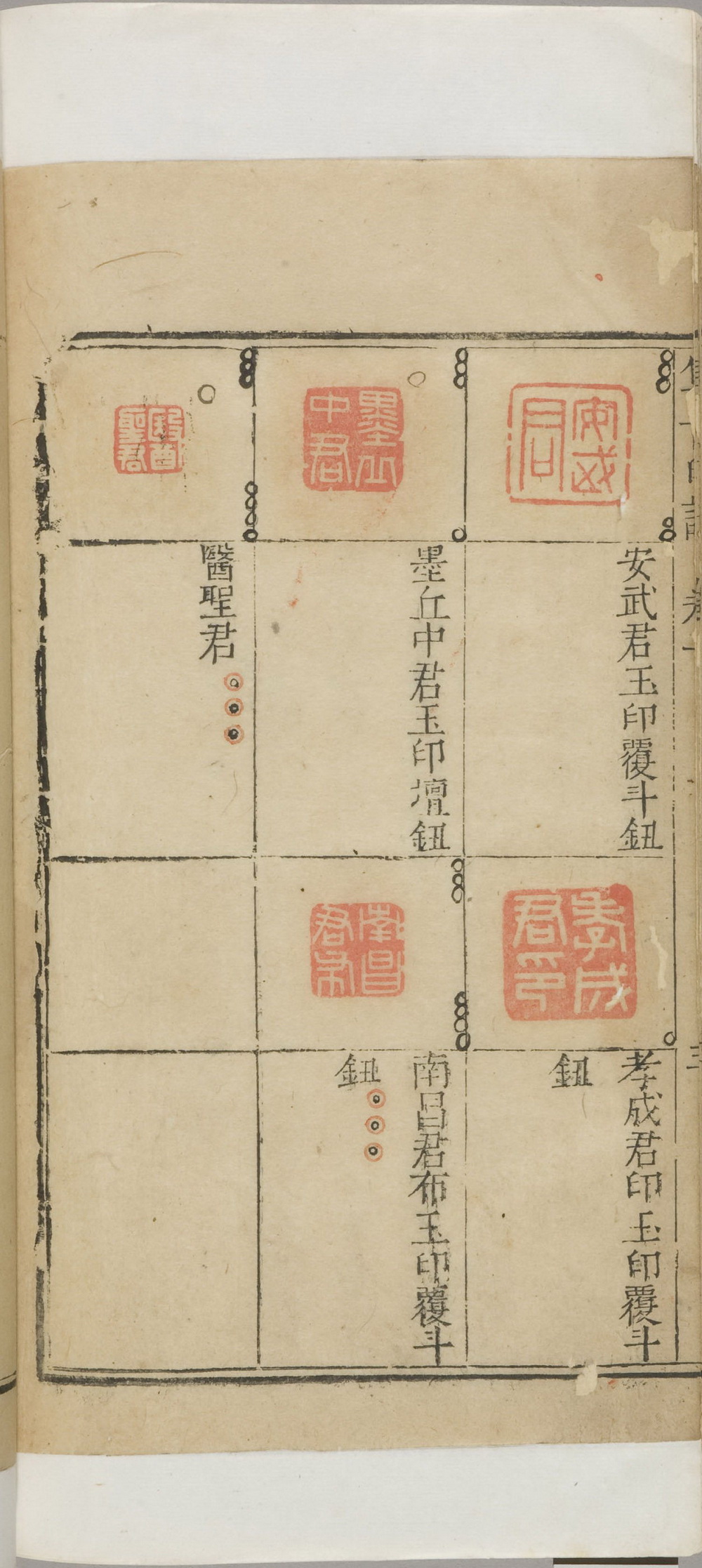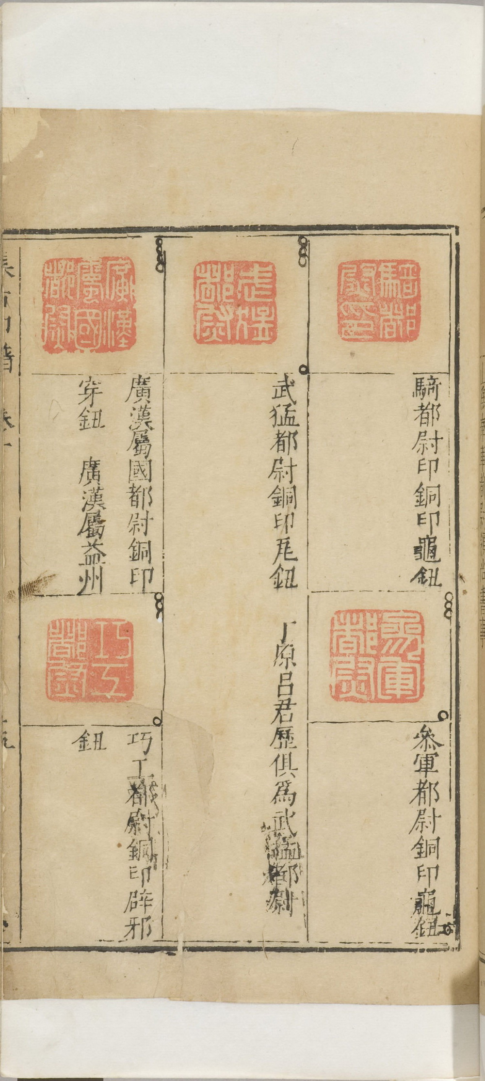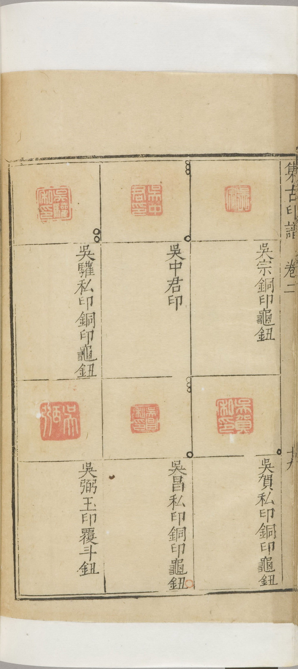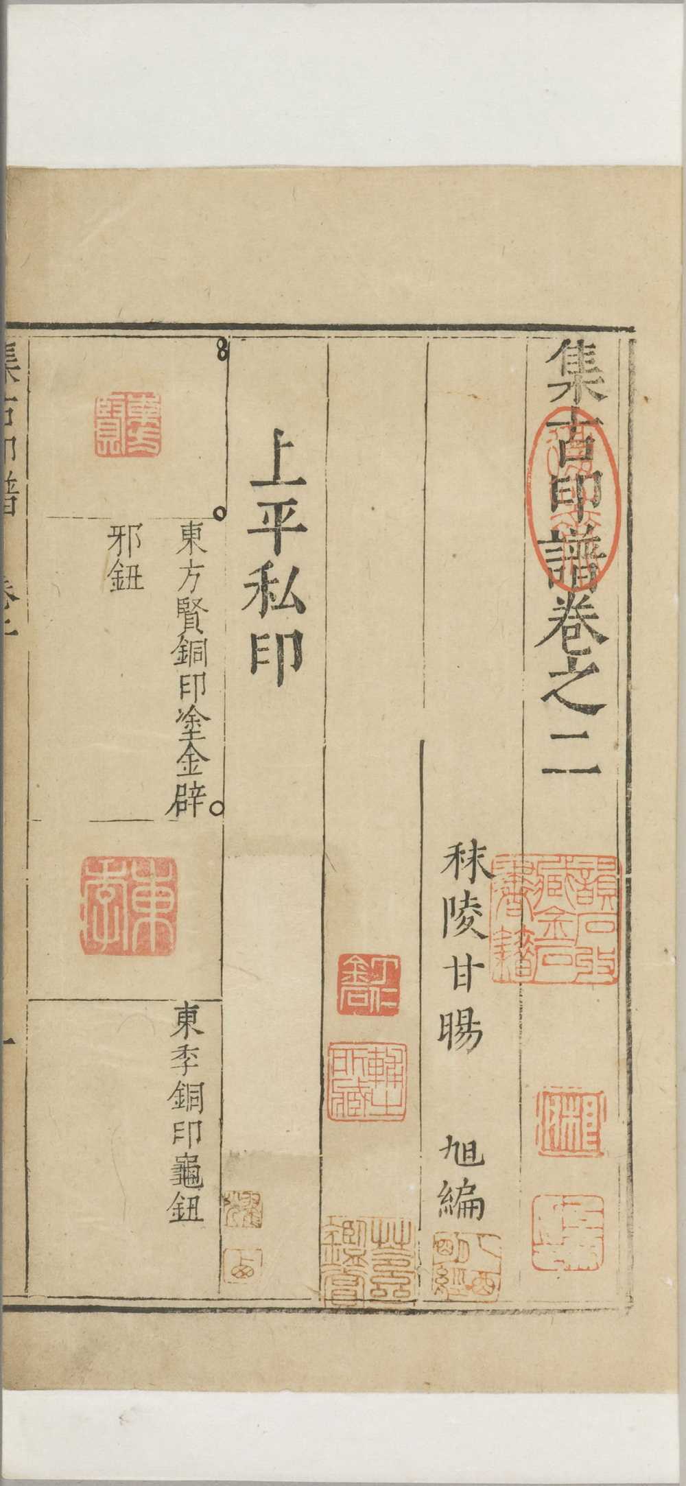 《集古印正》是明代篆刻家甘旸编著的一部集古印谱。全书共五卷,卷前朱刷传国玺三。卷一所录皆官印,卷二至卷五为私印,每叶横列印二排二枚至六枚不等,印文下均署纽制释文,末附印正附说。此为明万历二十四年钤印刊本,金镶玉装,部分书页有清代藏书者圈点和跋记。