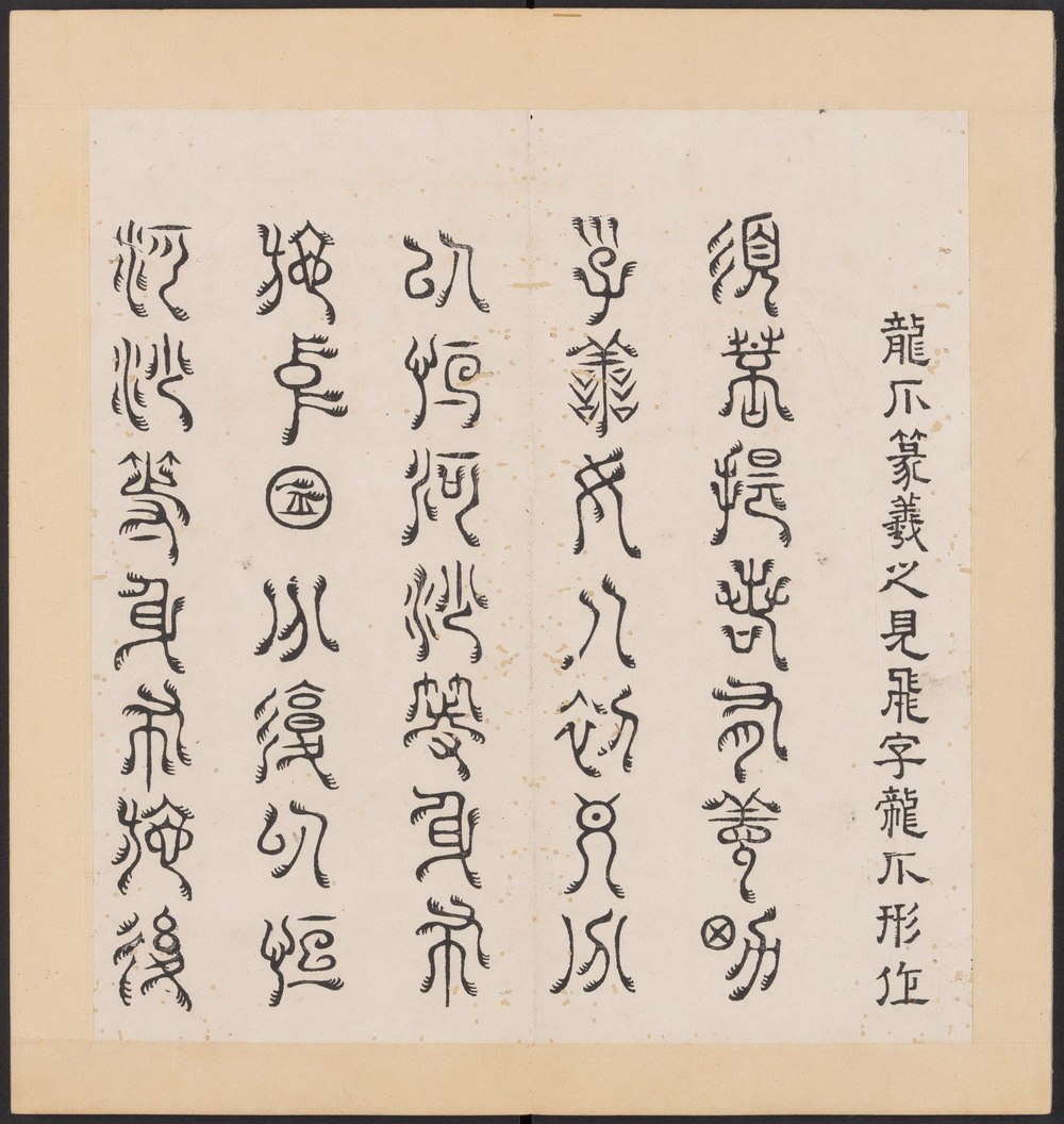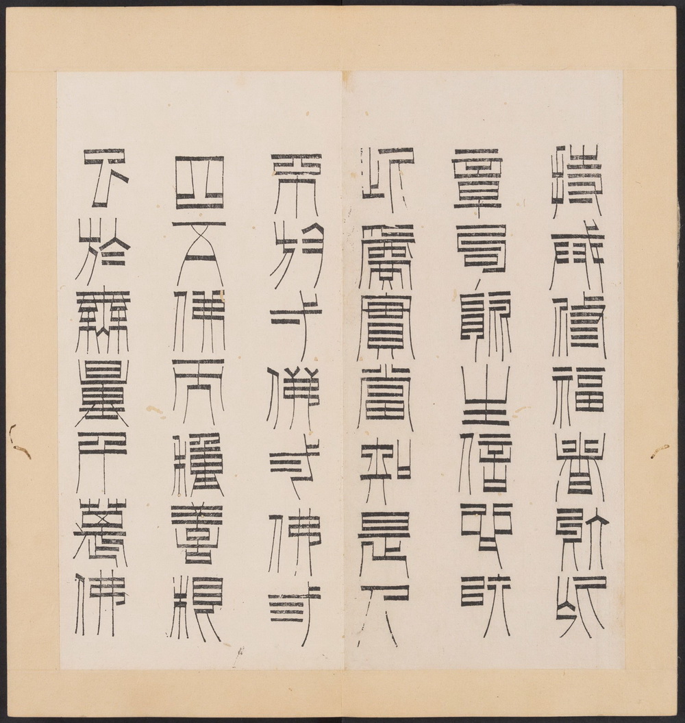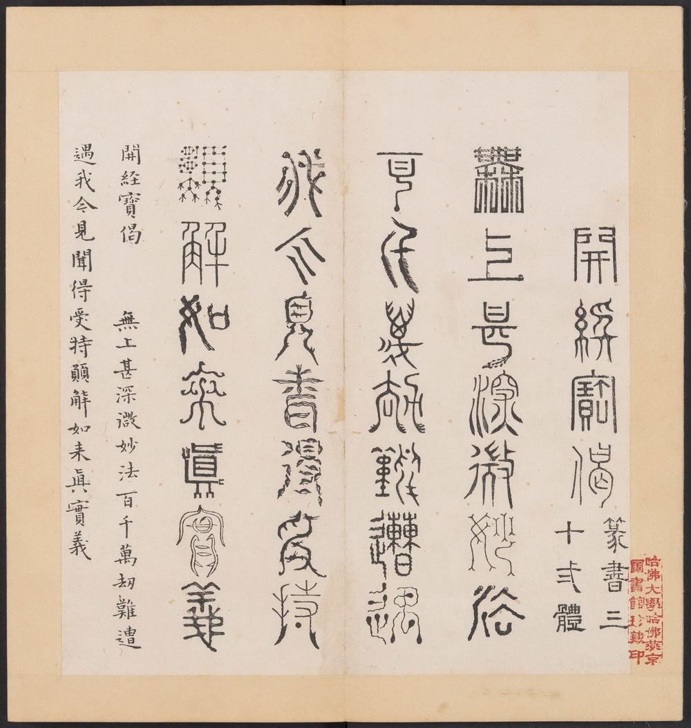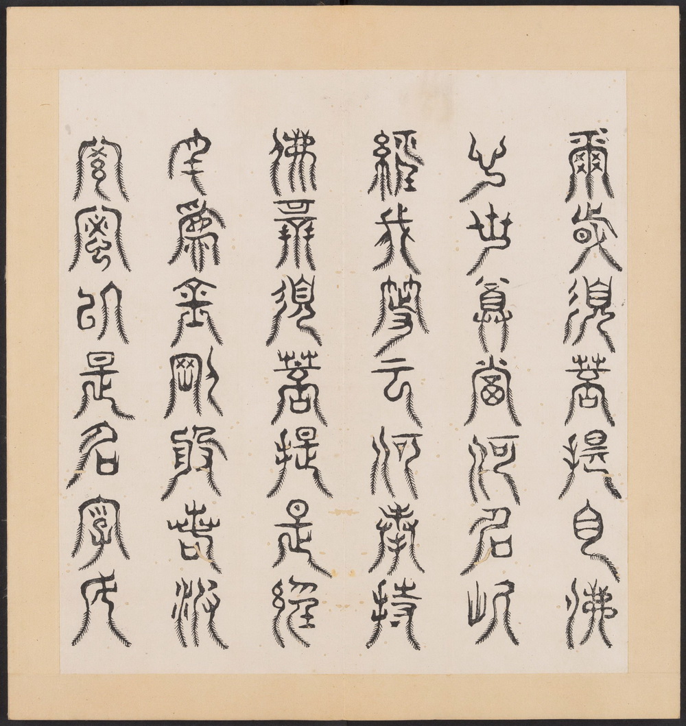 《金刚般若经集篆》由宋代灵隐禅寺僧人道肯集篆,明代洪度临书。全书以三十二体篆书分录《金刚般若波羅蜜经》经文为三十二品,每品一体(玉筯篆、奇字、大篆、小篆、上方大篆、坟书、穗书、倒薤篆、柳叶篆等等),并注记各体源流。封面书签题: 篆字金剛經 (三十二體)